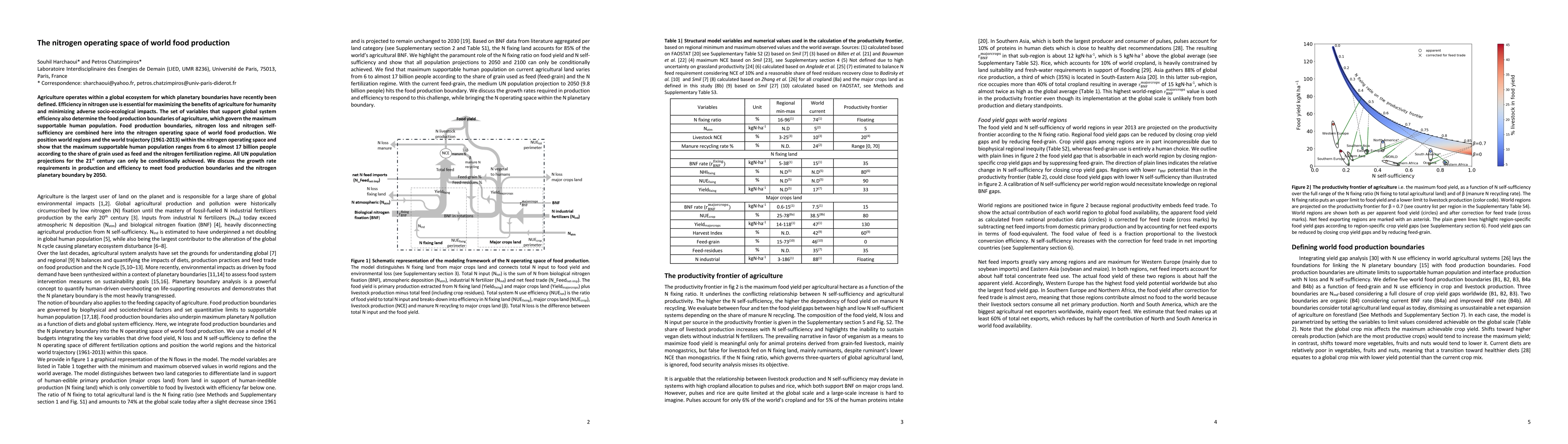 Agriculture operates within a global ecosystem for which planetary boundaries have recently been defined. Efficiency in nitrogen use is essential for maximizing the benefits of agriculture for humanity and minimizing adverse socio-ecological impacts. The set of variables that support global system efficiency also determine the food production boundaries of agriculture, which govern the maximum supportable human population. Food production boundaries, nitrogen loss and nitrogen self-sufficiency are combined here into the nitrogen operating space of world food production. We position world regions and the world trajectory (1961-2013) within the nitrogen operating space and show that the maximum supportable human population ranges from 6 to almost 17 billion people according to the share of grain used as feed and the nitrogen fertilization regime. All UN population projections for the 21st century can only be conditionally achieved. We discuss the growth rate requirements in production and efficiency to meet food production boundaries and the nitrogen planetary boundary by 2050.