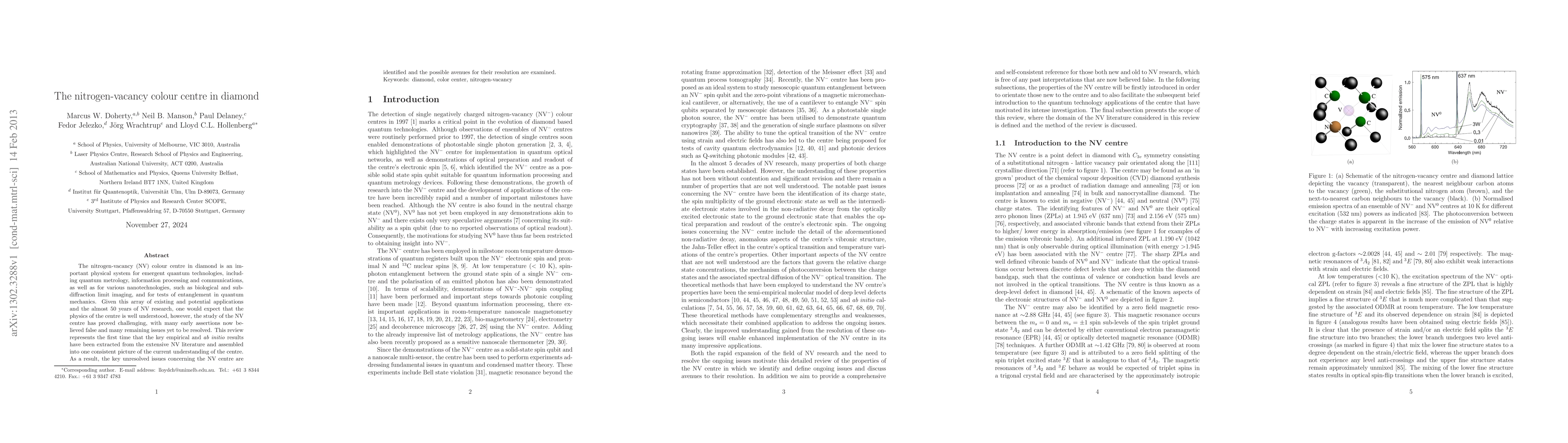 The nitrogen-vacancy (NV) colour centre in diamond is an important physical system for emergent quantum technologies, including quantum metrology, information processing and communications, as well as for various nanotechnologies, such as biological and sub-diffraction limit imaging, and for tests of entanglement in quantum mechanics. Given this array of existing and potential applications and the almost 50 years of NV research, one would expect that the physics of the centre is well understood, however, the study of the NV centre has proved challenging, with many early assertions now believed false and many remaining issues yet to be resolved. This review represents the first time that the key empirical and ab initio results have been extracted from the extensive NV literature and assembled into one consistent picture of the current understanding of the centre. As a result, the key unresolved issues concerning the NV centre are identified and the possible avenues for their resolution are examined.