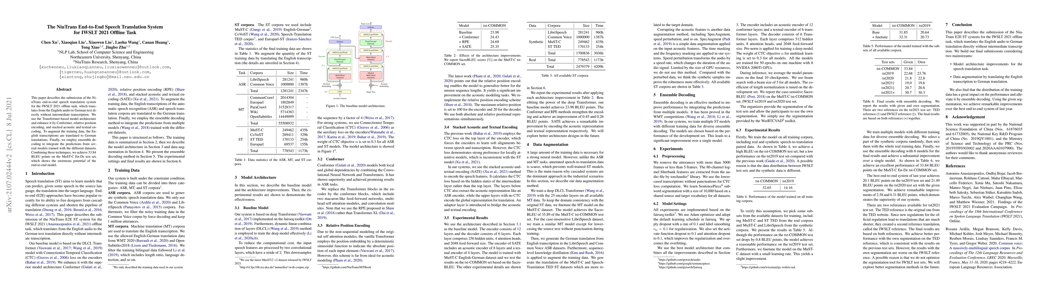 This paper presents the NiuTrans end-to-end speech translation system for the IWSLT 2021 offline task, employing a Transformer-based model enhanced with Conformer, relative position encoding, and ensemble decoding to achieve 33.84 BLEU points on the MuST-C En-De test set.