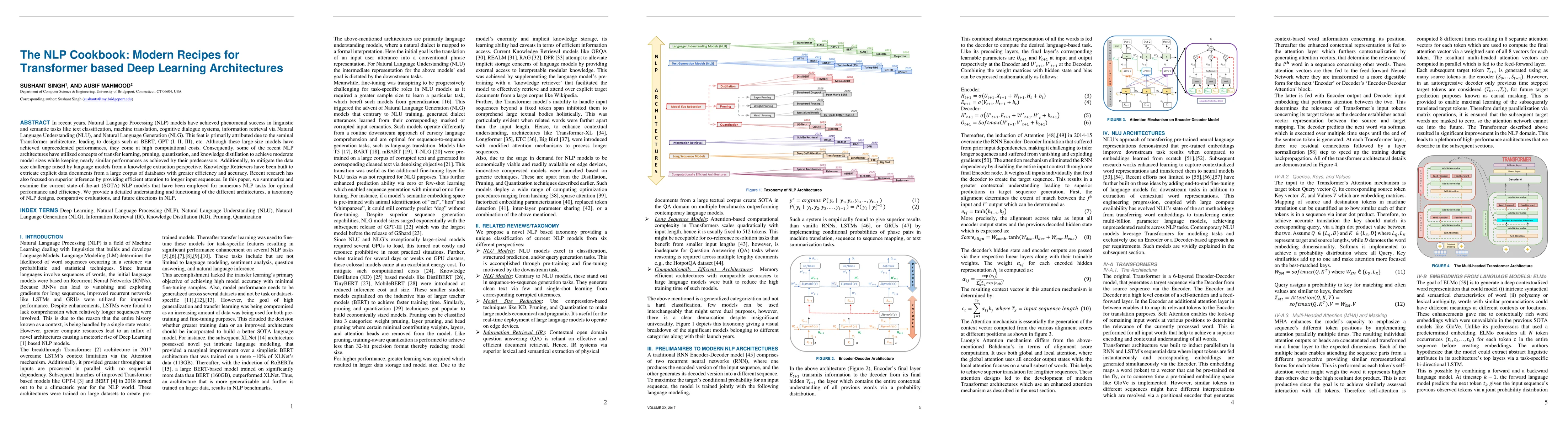 In recent years, Natural Language Processing (NLP) models have achieved phenomenal success in linguistic and semantic tasks like text classification, machine translation, cognitive dialogue systems, information retrieval via Natural Language Understanding (NLU), and Natural Language Generation (NLG). This feat is primarily attributed due to the seminal Transformer architecture, leading to designs such as BERT, GPT (I, II, III), etc. Although these large-size models have achieved unprecedented performances, they come at high computational costs. Consequently, some of the recent NLP architectures have utilized concepts of transfer learning, pruning, quantization, and knowledge distillation to achieve moderate model sizes while keeping nearly similar performances as achieved by their predecessors. Additionally, to mitigate the data size challenge raised by language models from a knowledge extraction perspective, Knowledge Retrievers have been built to extricate explicit data documents from a large corpus of databases with greater efficiency and accuracy. Recent research has also focused on superior inference by providing efficient attention to longer input sequences. In this paper, we summarize and examine the current state-of-the-art (SOTA) NLP models that have been employed for numerous NLP tasks for optimal performance and efficiency. We provide a detailed understanding and functioning of the different architectures, a taxonomy of NLP designs, comparative evaluations, and future directions in NLP.
