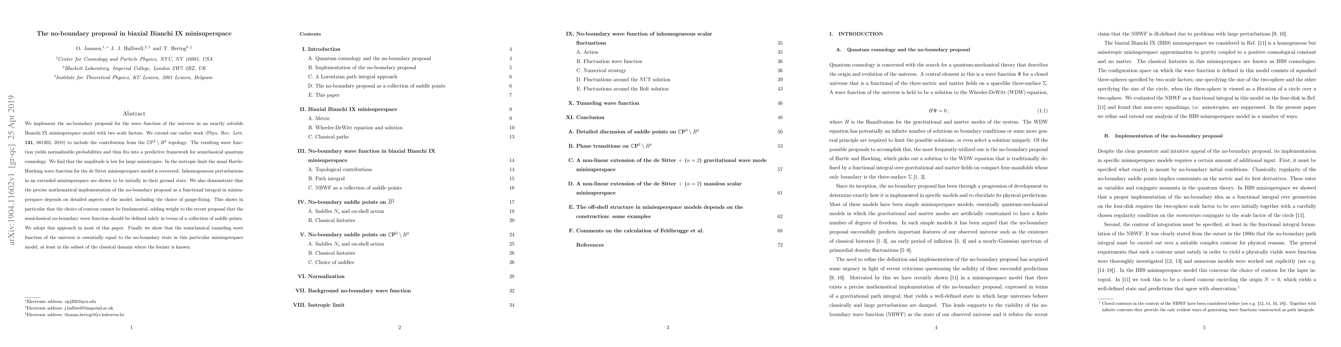We implement the no-boundary proposal for the wave function of the universe in an exactly solvable Bianchi IX minisuperspace model with two scale factors. We extend our earlier work (Phys. Rev. Lett. 121, 081302, 2018 / arXiv:1804.01102) to include the contribution from the $\mathbb{C}\text{P}^2 \setminus B^4$ topology. The resulting wave function yields normalizable probabilities and thus fits into a predictive framework for semiclassical quantum cosmology. We find that the amplitude is low for large anisotropies. In the isotropic limit the usual Hartle-Hawking wave function for the de Sitter minisuperspace model is recovered. Inhomogeneous perturbations in an extended minisuperspace are shown to be initially in their ground state. We also demonstrate that the precise mathematical implementation of the no-boundary proposal as a functional integral in minisuperspace depends on detailed aspects of the model, including the choice of gauge-fixing. This shows in particular that the choice of contour cannot be fundamental, adding weight to the recent proposal that the semiclassical no-boundary wave function should be defined solely in terms of a collection of saddle points. We adopt this approach in most of this paper. Finally we show that the semiclassical tunneling wave function of the universe is essentially equal to the no-boundary state in this particular minisuperspace model, at least in the subset of the classical domain where the former is known.