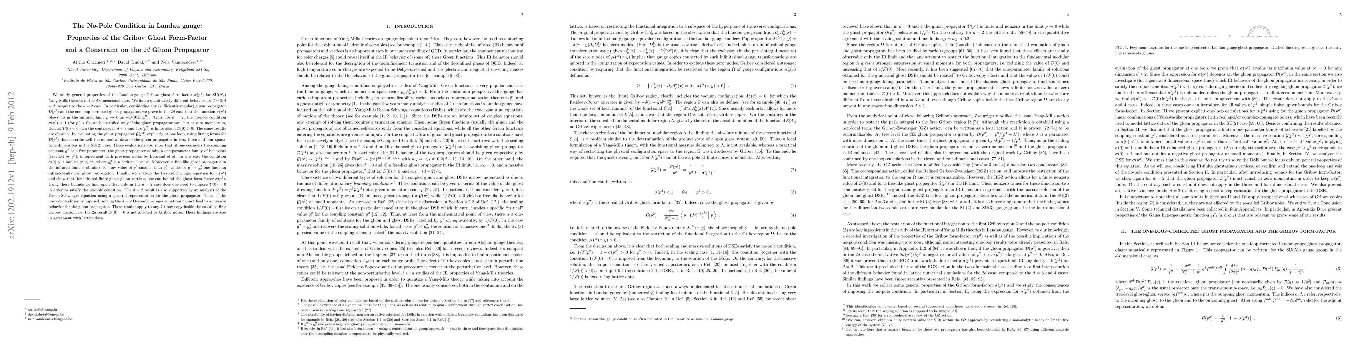 The paper investigates the Landau gauge Gribov ghost form-factor sigma(p^2) in different dimensions, revealing a qualitatively different behavior for d=3,4 compared to d=2, with sigma(p^2) blowing up in the infrared limit for d=2 unless D(0)=0.