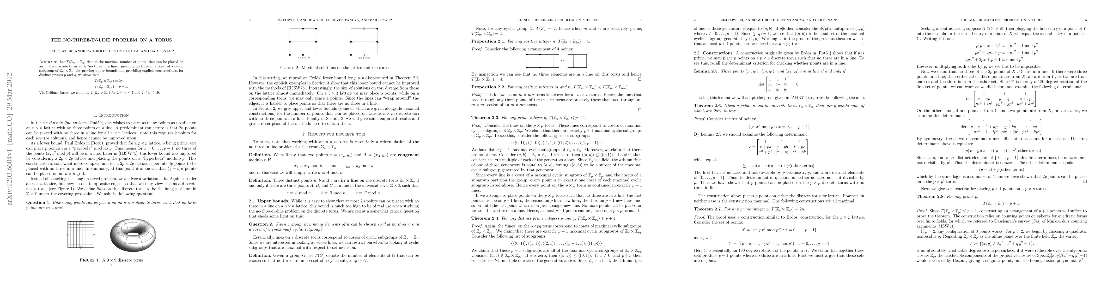 Researchers prove upper bounds for placing points on a discrete torus without three in a line, finding specific constructions with 2p and p+1 points for certain prime pairs.