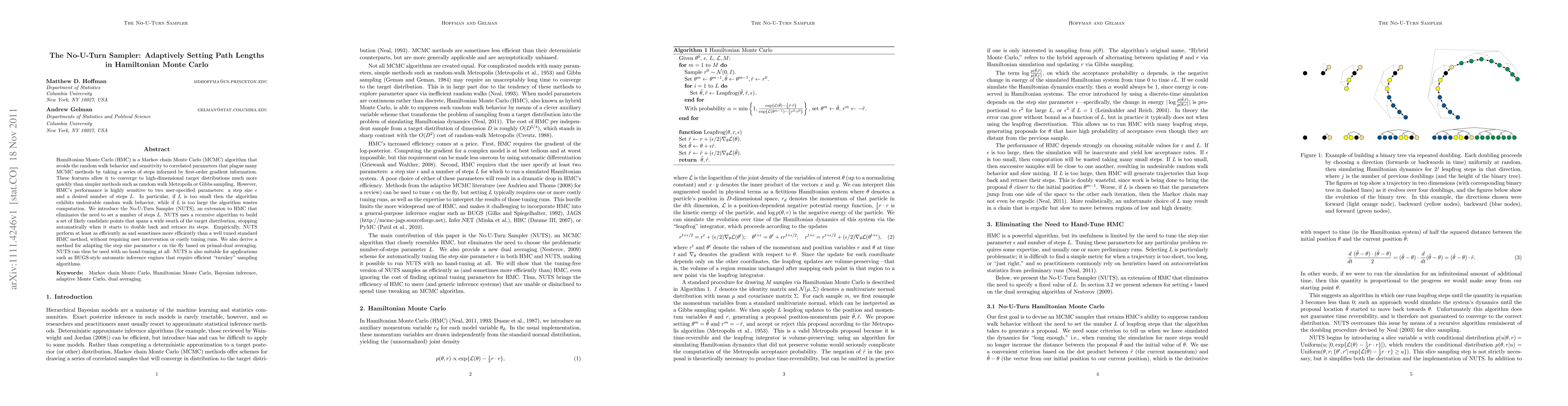 The No-U-Turn Sampler (NUTS) is an adaptive extension of Hamiltonian Monte Carlo (HMC) that automatically determines the number of steps, eliminating the need for manual tuning. It efficiently samples high-dimensional distributions by stopping when it begins to retrace steps, thus avoiding both random walk behavior and computational waste.