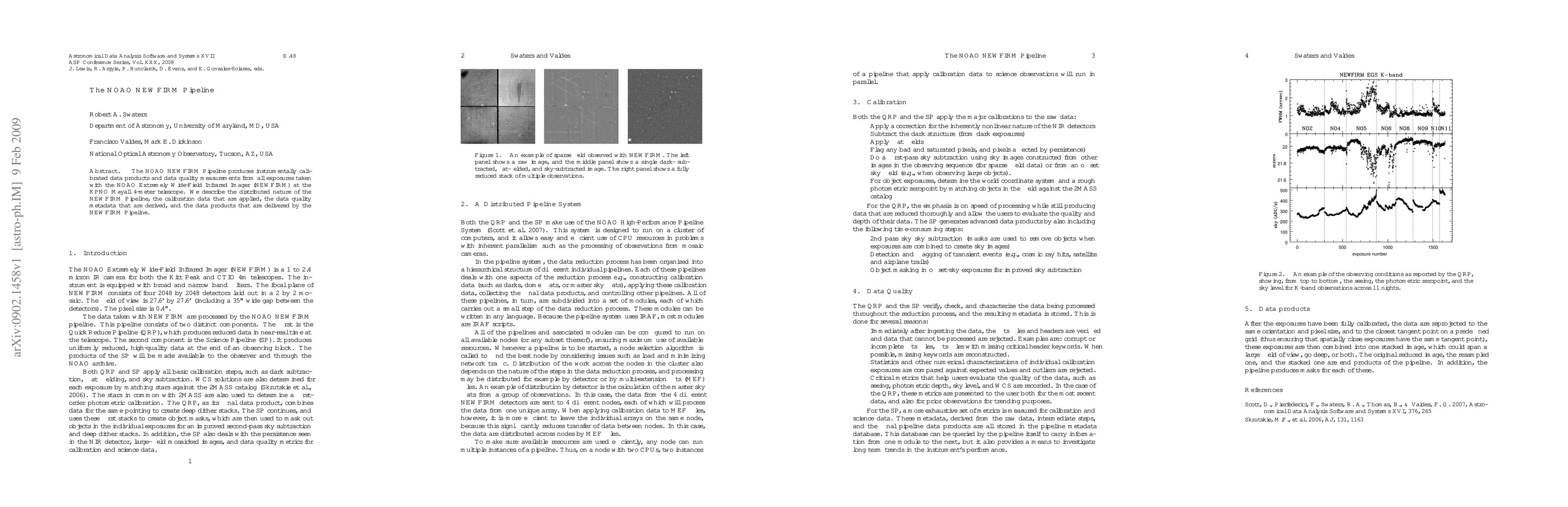 The NOAO NEWFIRM Pipeline produces instrumentally calibrated data products and data quality measurements from all exposures taken with the NOAO Extremely Wide-Field Infrared Imager (NEWFIRM) at the KPNO Mayall 4-meter telescope. We describe the distributed nature of the NEWFIRM Pipeline, the calibration data that are applied, the data quality metadata that are derived, and the data products that are delivered by the NEWFIRM Pipeline.
