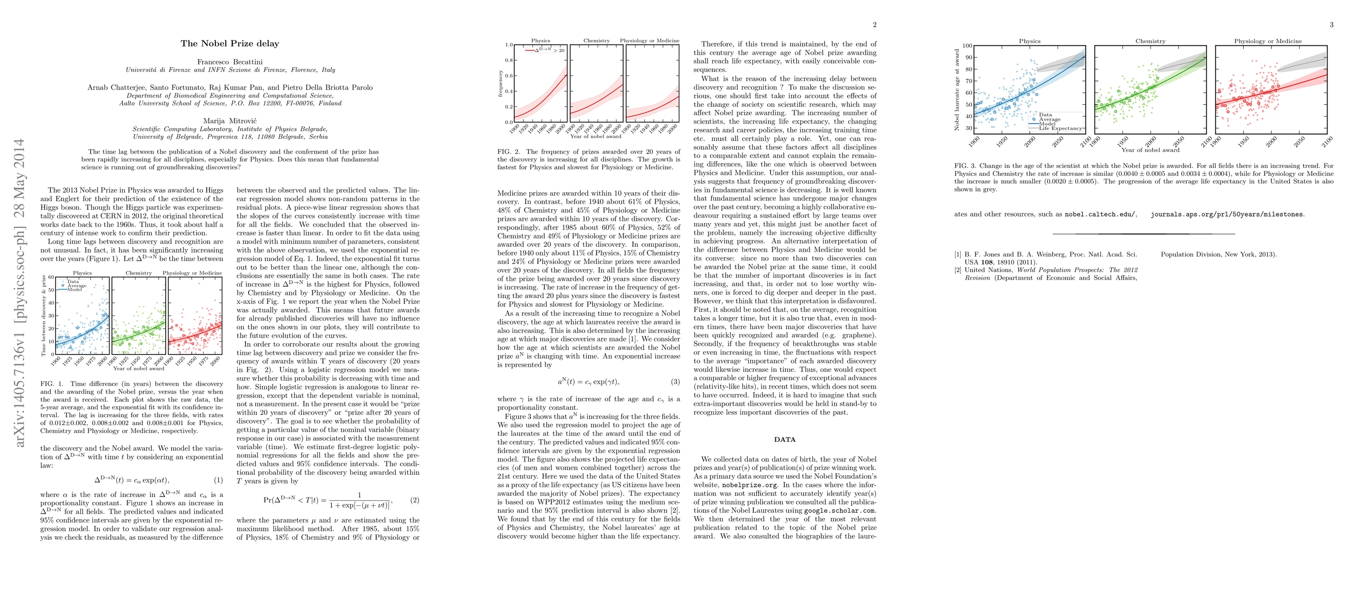The time lag between the publication of a Nobel discovery and the conferment of the prize has been rapidly increasing for all disciplines, especially for Physics. Does this mean that fundamental science is running out of groundbreaking discoveries?