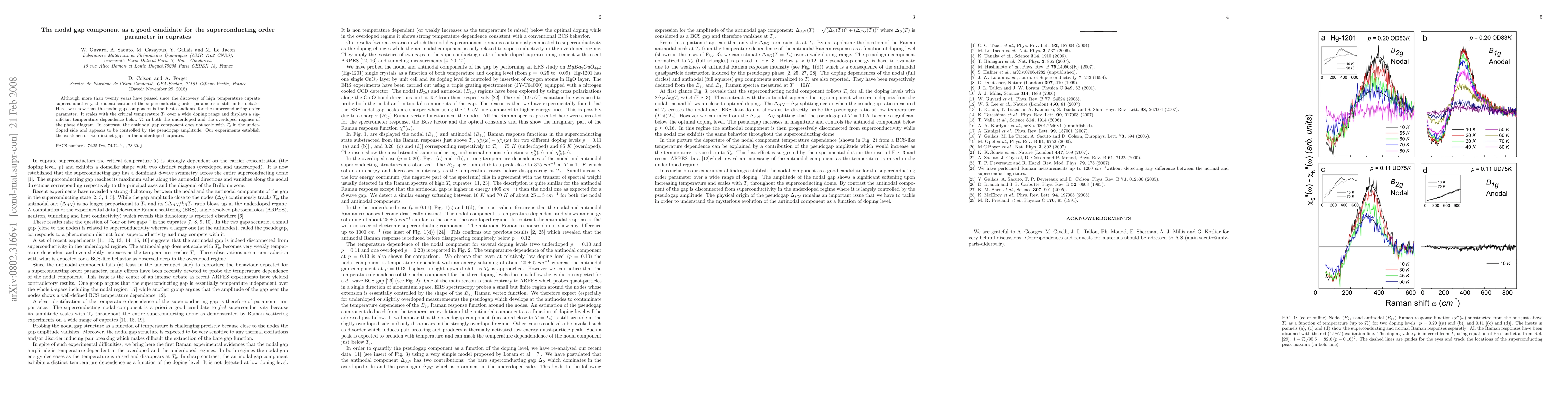 This paper argues that the nodal gap component in cuprates is the best candidate for the superconducting order parameter, as it scales with critical temperature $T_c$ across various doping levels and shows significant temperature dependence below $T_c$. In contrast, the antinodal gap component is not correlated with $T_c$ in underdoped regions and is linked to the pseudogap amplitude.