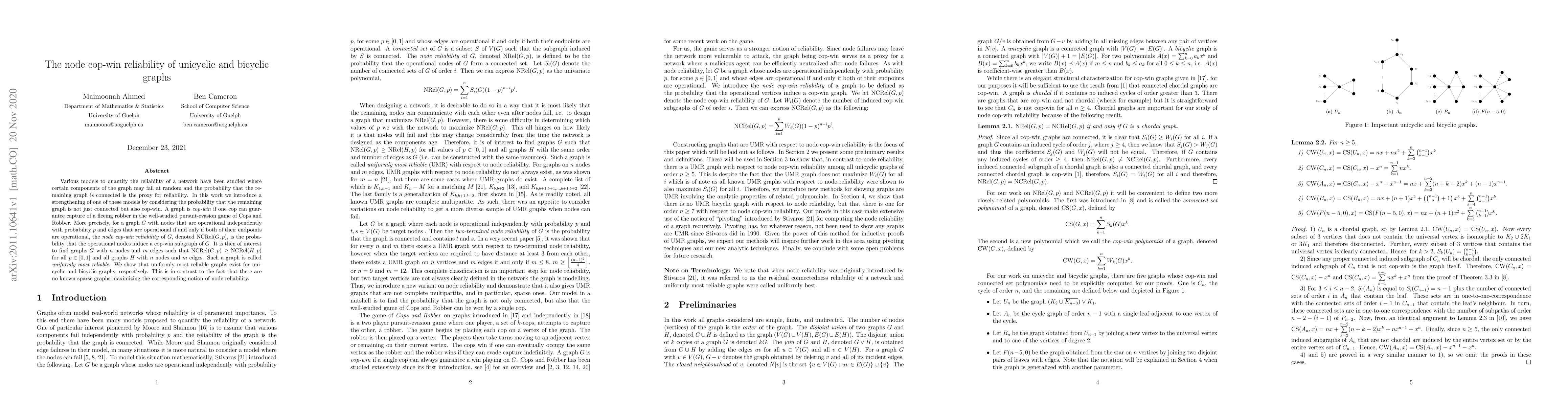 Various models to quantify the reliability of a network have been studied where certain components of the graph may fail at random and the probability that the remaining graph is connected is the proxy for reliability. In this work we introduce a strengthening of one of these models by considering the probability that the remaining graph is not just connected but also cop-win. A graph is cop-win if one cop can guarantee capture of a fleeing robber in the well-studied pursuit-evasion game of Cops and Robber. More precisely, for a graph $G$ with nodes that are operational independently with probability $p$ and edges that are operational if and only if both of their endpoints are operational, the node cop-win reliability of $G$, denoted $\text{NCRel}(G,p)$, is the probability that the operational nodes induce a cop-win subgraph of $G$. It is then of interest to find graphs $G$ with $n$ nodes and $m$ edges such that $\text{NCRel}(G,p)\ge\text{NCRel}(H,p)$ for all $p\in[0,1]$ and all graphs $H$ with $n$ nodes and $m$ edges. Such a graph is called uniformly most reliable. We show that uniformly most reliable graphs exist for unicyclic and bicyclic graphs, respectively. This is in contrast to the fact that there are no known sparse graphs maximizing the corresponding notion of node reliability.