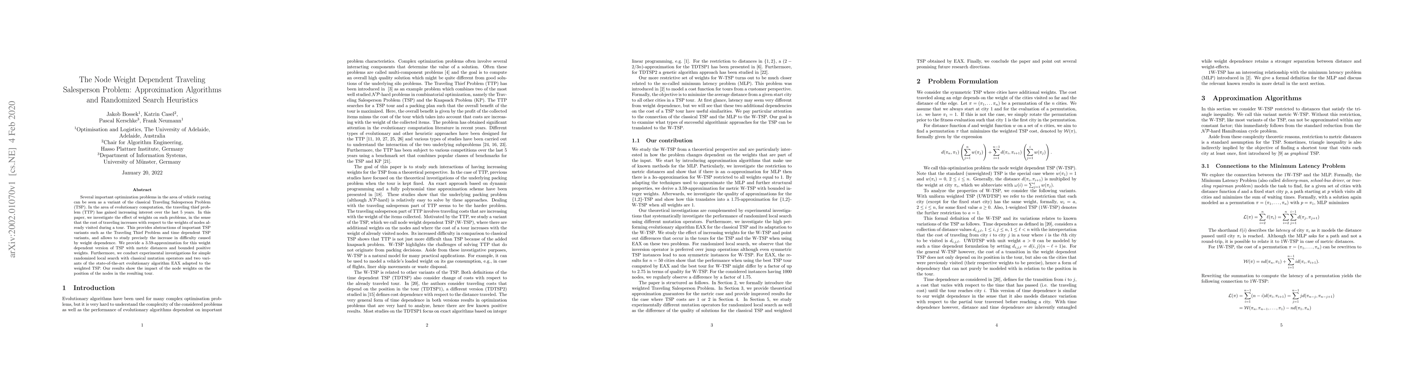 This paper explores the Node Weight Dependent Traveling Salesperson Problem (NWDTSP), providing a 3.59-approximation algorithm and investigating its complexity through randomized search heuristics. Experimental results highlight the influence of node weights on tour configurations using evolutionary algorithms.