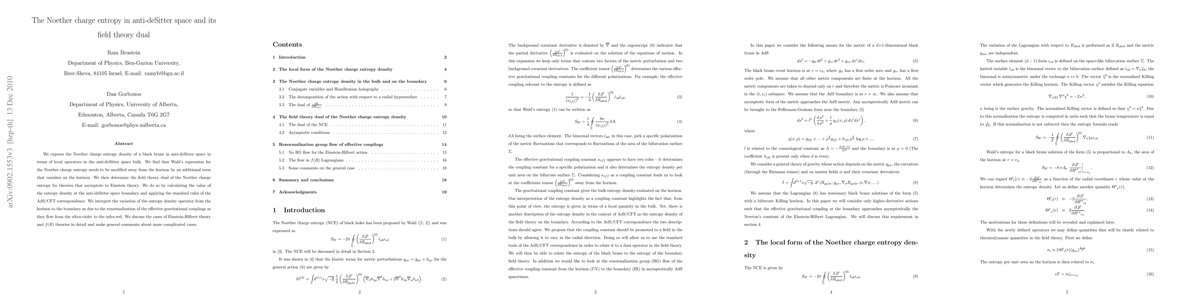 This paper modifies the Noether charge entropy expression for black branes in anti-deSitter space and determines its field theory dual via the AdS/CFT correspondence, attributing changes in the entropy density to gravitational coupling renormalization. It specifically examines Einstein-Hilbert and f(R) theories.
