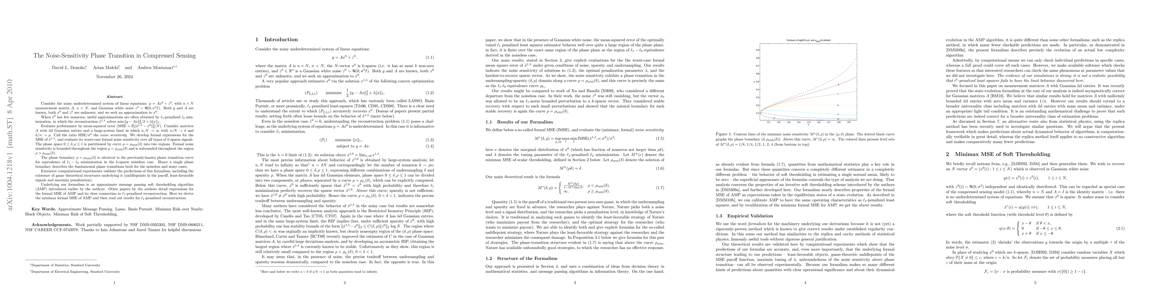 Consider the noisy underdetermined system of linear equations: y=Ax0 + z0, with n x N measurement matrix A, n < N, and Gaussian white noise z0 ~ N(0,\sigma^2 I). Both y and A are known, both x0 and z0 are unknown, and we seek an approximation to x0. When x0 has few nonzeros, useful approximations are obtained by l1-penalized l2 minimization, in which the reconstruction \hxl solves min || y - Ax||^2/2 + \lambda ||x||_1. Evaluate performance by mean-squared error (MSE = E ||\hxl - x0||_2^2/N). Consider matrices A with iid Gaussian entries and a large-system limit in which n,N\to\infty with n/N \to \delta and k/n \to \rho. Call the ratio MSE/\sigma^2 the noise sensitivity. We develop formal expressions for the MSE of \hxl, and evaluate its worst-case formal noise sensitivity over all types of k-sparse signals. The phase space 0 < \delta, \rho < 1 is partitioned by curve \rho = \rhoMSE(\delta) into two regions. Formal noise sensitivity is bounded throughout the region \rho < \rhoMSE(\delta) and is unbounded throughout the region \rho > \rhoMSE(\delta). The phase boundary \rho = \rhoMSE(\delta) is identical to the previously-known phase transition curve for equivalence of l1 - l0 minimization in the k-sparse noiseless case. Hence a single phase boundary describes the fundamental phase transitions both for the noiseless and noisy cases. Extensive computational experiments validate the predictions of this formalism, including the existence of game theoretical structures underlying it. Underlying our formalism is the AMP algorithm introduced earlier by the authors. Other papers by the authors detail expressions for the formal MSE of AMP and its close connection to l1-penalized reconstruction. Here we derive the minimax formal MSE of AMP and then read out results for l1-penalized reconstruction.