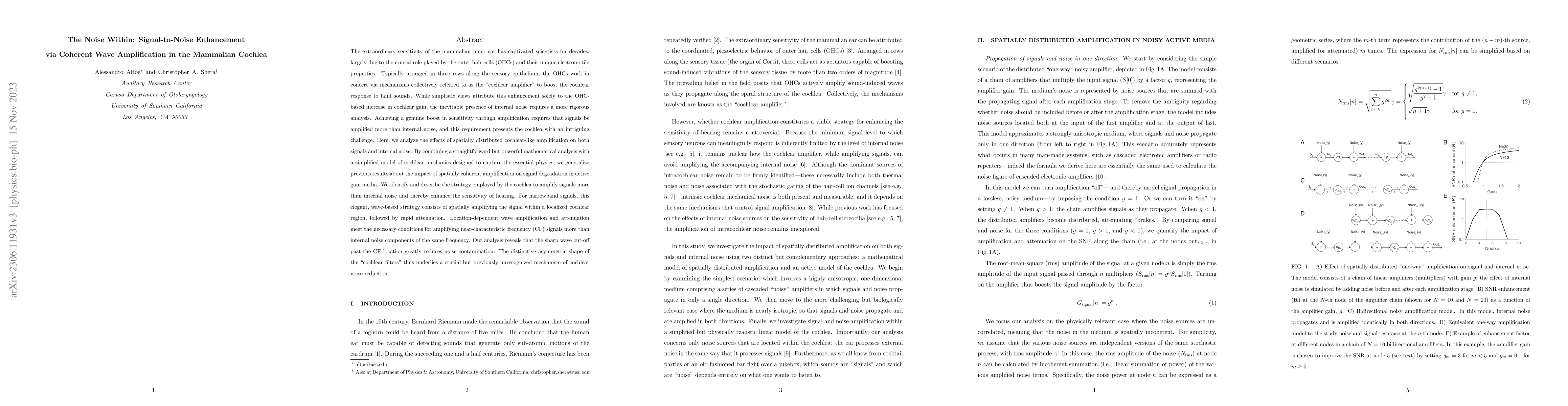 The extraordinary sensitivity of the mammalian inner ear has captivated scientists for decades, largely due to the crucial role played by the outer hair cells (OHCs) and their unique electromotile properties. Typically arranged in three rows along the sensory epithelium, the OHCs work in concert via mechanisms collectively referred to as the "cochlear amplifier" to boost the cochlear response to faint sounds. While simplistic views attribute this enhancement solely to the OHC-based increase in cochlear gain, the inevitable presence of internal noise requires a more rigorous analysis. Achieving a genuine boost in sensitivity through amplification requires that signals be amplified more than internal noise, and this requirement presents the cochlea with an intriguing challenge. Here, we analyze the effects of spatially distributed cochlear-like amplification on both signals and internal noise.