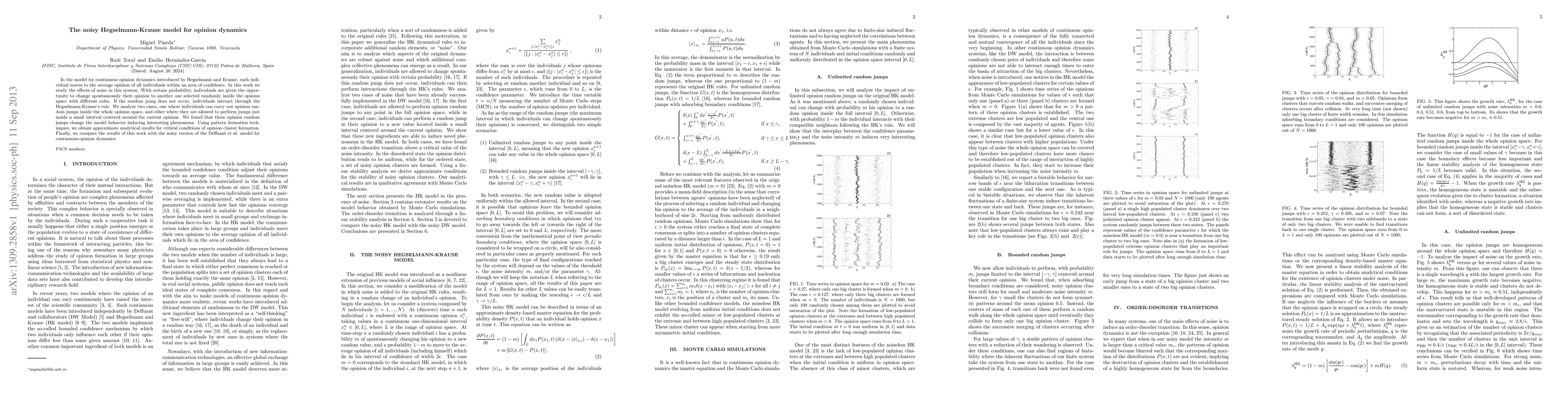 The research analyzes the Hegselmann-Krause model for opinion dynamics under the influence of opinion noise, comparing it with the Deffuant et al. model using Monte Carlo simulations and a density-based master equation.
