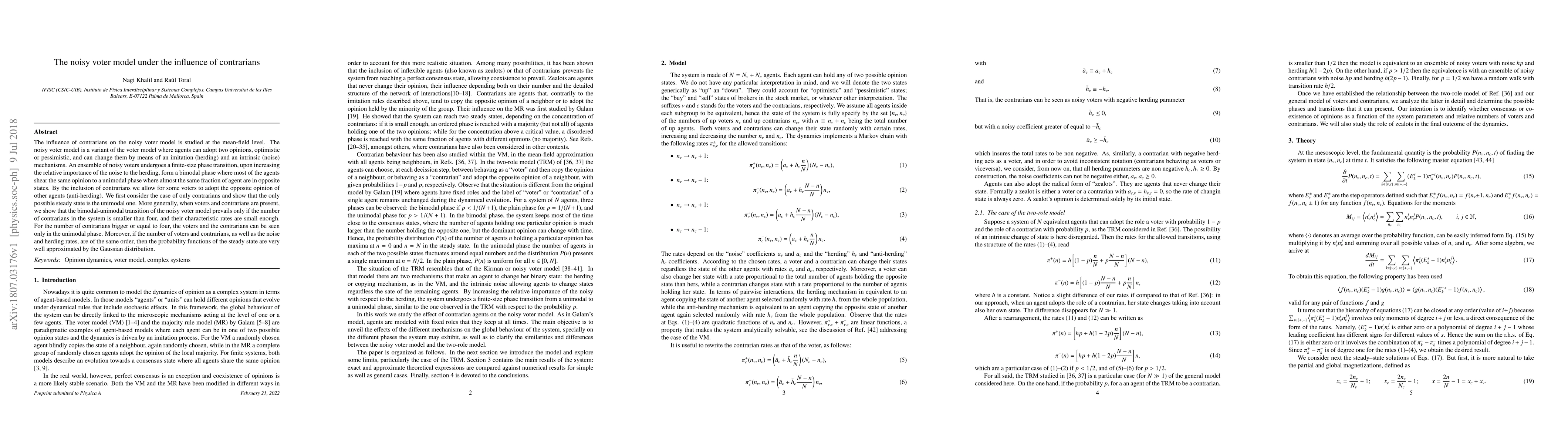 This paper investigates how contrarians affect the noisy voter model, showing that their presence leads to a unimodal phase where agents predominantly hold opposite opinions. It finds that the bimodal-unimodal transition occurs only when the number of contrarians is below four and their rates are sufficiently low.