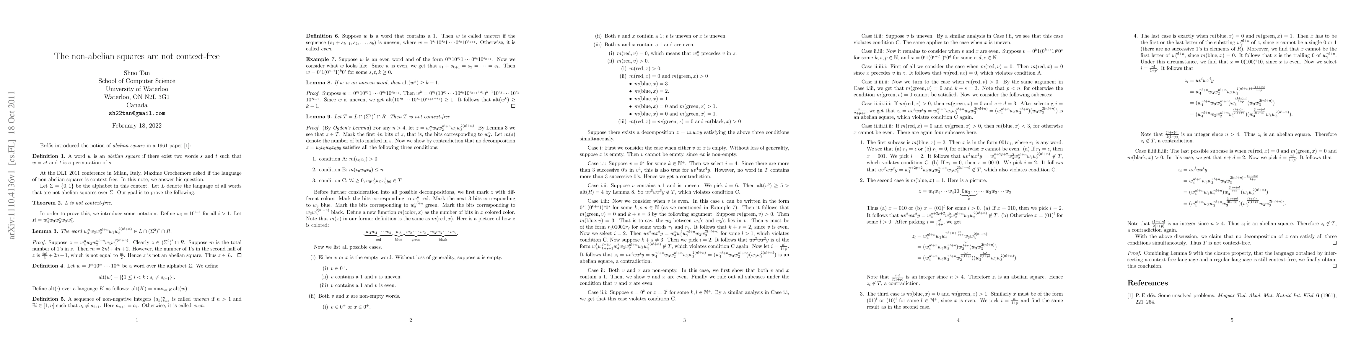 Answering a recent question of Crochemore, we prove that the language of words that are not abelian squares is not context-free.