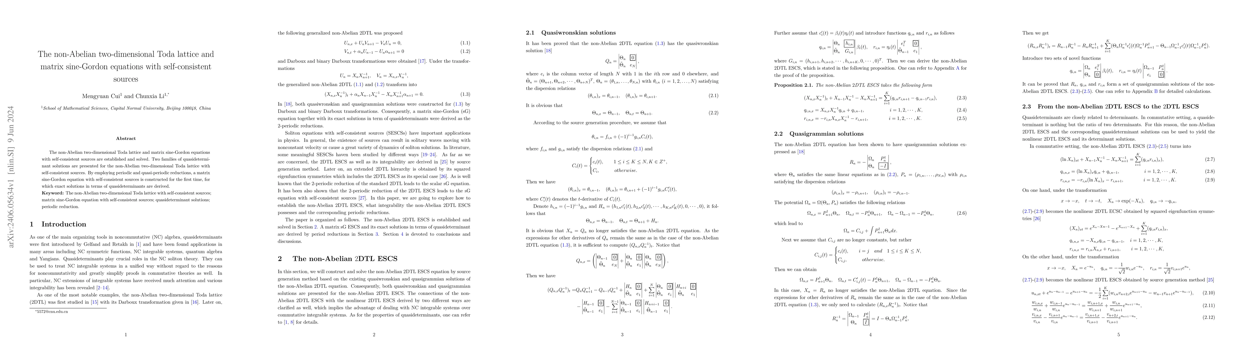 This paper establishes and solves the non-Abelian two-dimensional Toda lattice and matrix sine-Gordon equations with self-consistent sources, presenting quasideterminant solutions for both systems and deriving exact solutions for the matrix sine-Gordon equation via periodic and quasi-periodic reductions.