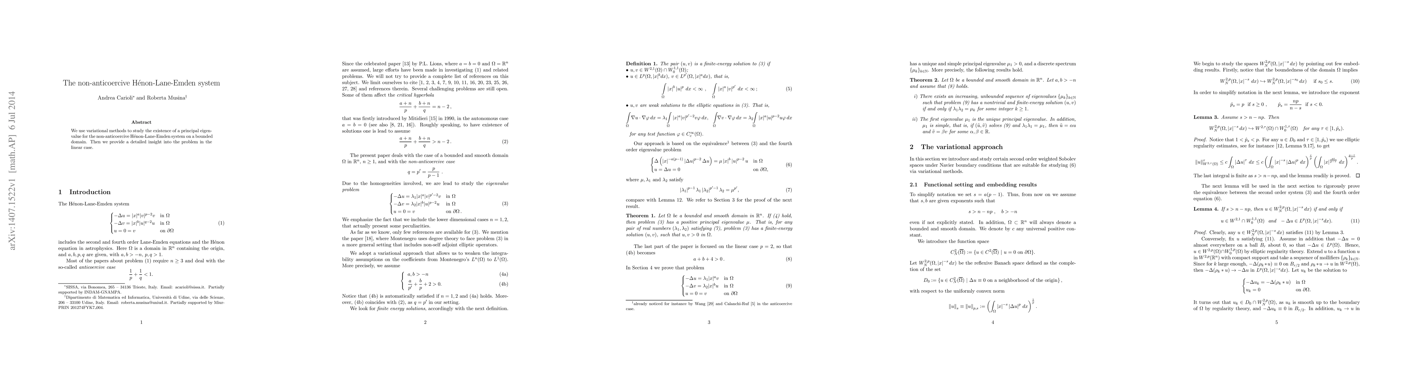 We use variational methods to study the existence of a principal eigenvalue for the non-anticoercive H\'enon-Lane-Emden system on a bounded domain. Then we provide a detailed insight into the problem in the linear case.