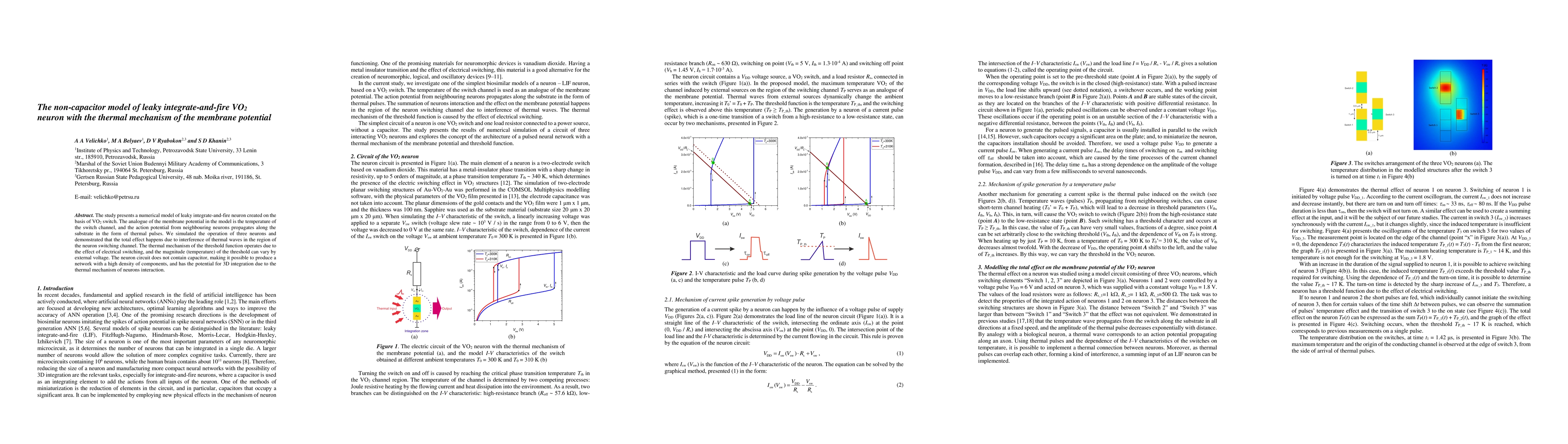 The study presents a numerical model of leaky integrate-and-fire neuron created on the basis of $VO_2$ switch. The analogue of the membrane potential in the model is the temperature of the switch channel, and the action potential from neighbouring neurons propagates along the substrate in the form of thermal pulses. We simulated the operation of three neurons and demonstrated that the total effect happens due to interference of thermal waves in the region of the neuron switching channel. The thermal mechanism of the threshold function operates due to the effect of electrical switching, and the magnitude (temperature) of the threshold can vary by external voltage. The neuron circuit does not contain capacitor, making it possible to produce a network with a high density of components, and has the potential for 3D integration due to the thermal mechanism of neurons interaction.
