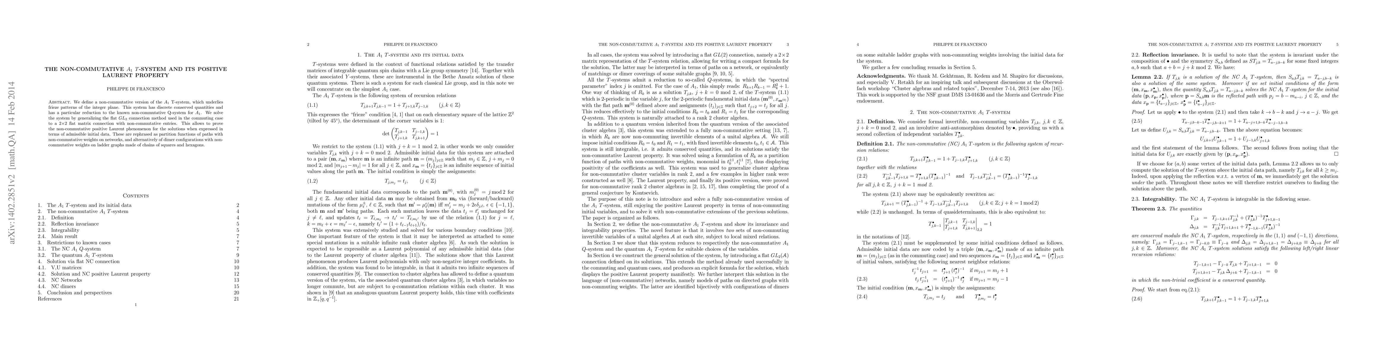 This paper introduces a non-commutative version of the $A_1$ T-system, solving it via a generalized 2×2 flat matrix connection method. It demonstrates the non-commutative positive Laurent phenomenon for the solutions, interpreted as partition functions of paths or dimer configurations with non-commutative weights.