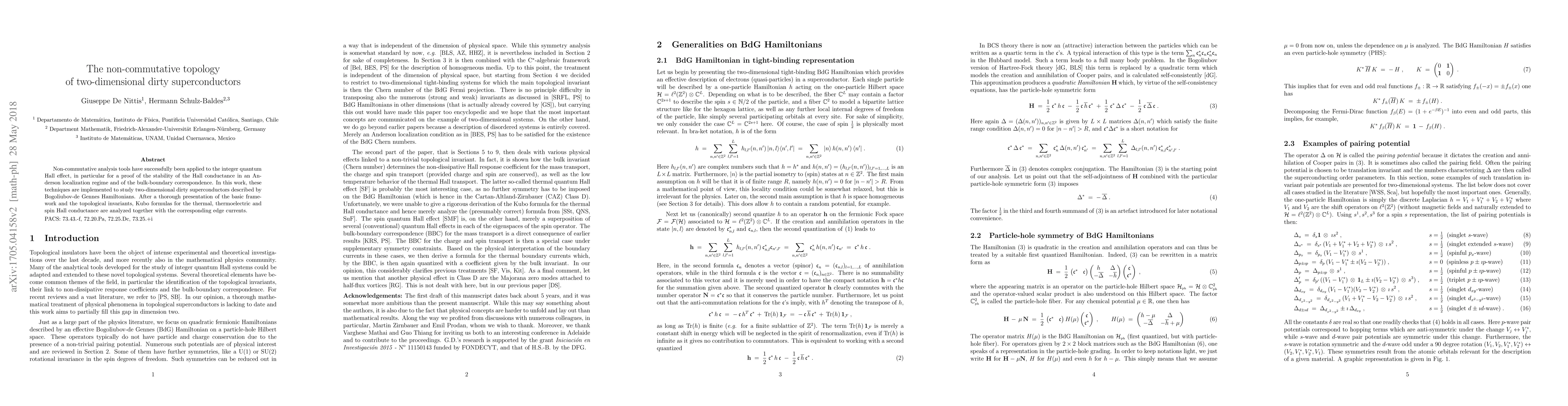 Non-commutative analysis tools have successfully been applied to the integer quantum Hall effect, in particular for a proof of the stability of the Hall conductance in an Anderson localization regime and of the bulk-boundary correspondence. In this work, these techniques are implemented to study two-dimensional dirty superconductors described by Bogoliubov-de Gennes Hamiltonians. After a thorough presentation of the basic framework and the topological invariants, Kubo formulas for the thermal, thermoelectric and spin Hall conductance are analyzed together with the corresponding edge currents.