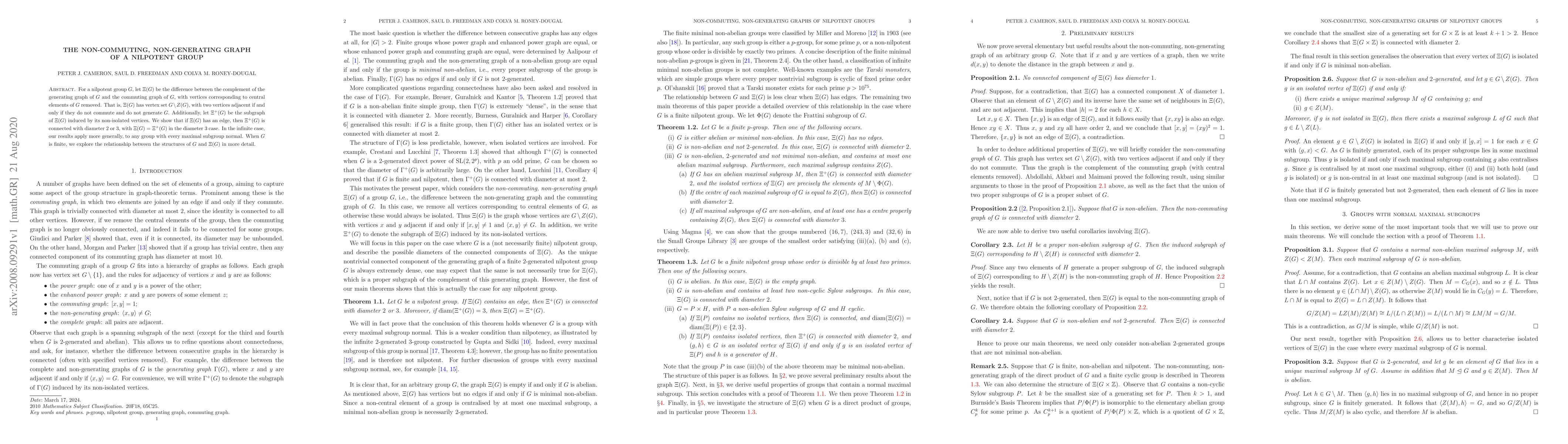 This paper investigates the non-commuting, non-generating graph $\Xi(G)$ of a nilpotent group $G$, showing that if $\Xi(G)$ contains an edge, then $\Xi^+(G)$, its non-isolated subgraph, is connected with diameter $2$ or $3$. The infinite case extends to groups with every maximal subgroup normal.