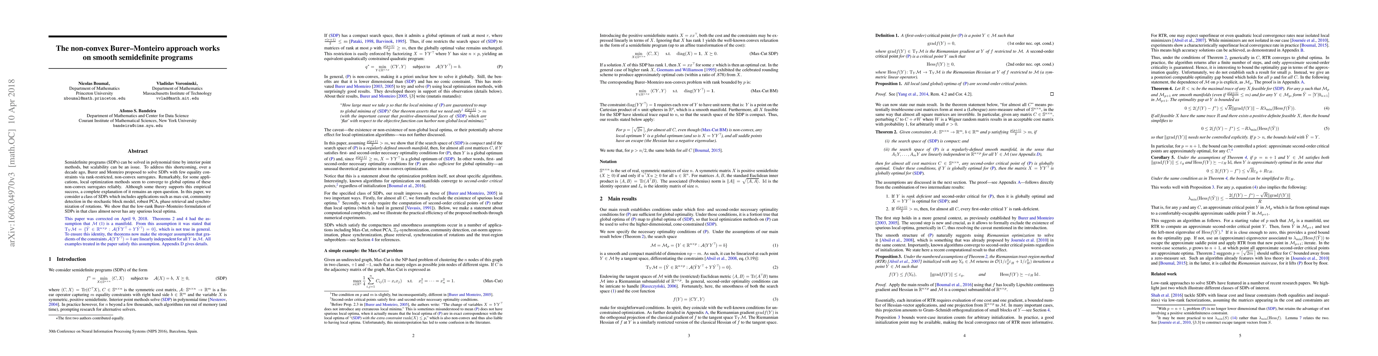 The paper analyzes the Burer-Monteiro approach for solving semidefinite programs (SDPs) with few equality constraints by examining the non-convex surrogates. It focuses on a class of SDPs that includes applications like max-cut, community detection, robust PCA, phase retrieval, and synchronization of rotations.