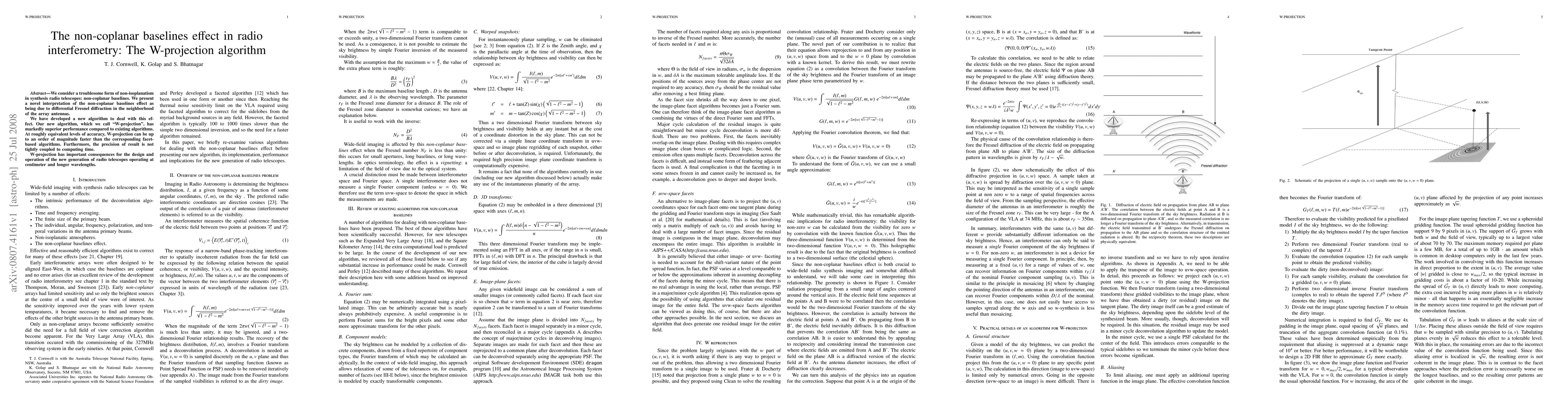 We consider a troublesome form of non-isoplanatism in synthesis radio telescopes: non-coplanar baselines. We present a novel interpretation of the non-coplanar baselines effect as being due to differential Fresnel diffraction in the neighborhood of the array antennas. We have developed a new algorithm to deal with this effect. Our new algorithm, which we call "W-projection", has markedly superior performance compared to existing algorithms. At roughly equivalent levels of accuracy, W-projection can be up to an order of magnitude faster than the corresponding facet-based algorithms. Furthermore, the precision of result is not tightly coupled to computing time. W-projection has important consequences for the design and operation of the new generation of radio telescopes operating at centimeter and longer wavelengths.