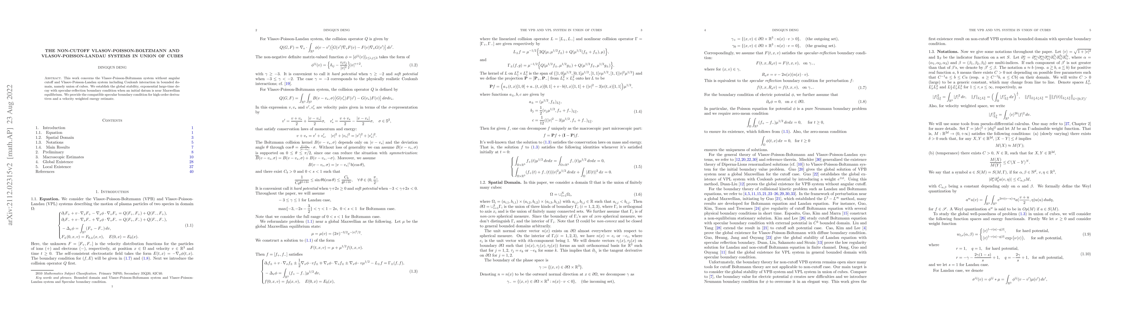 This paper investigates the non-cutoff Vlasov-Poisson-Boltzmann and Vlasov-Poisson-Landau systems in a union of cubes, establishing global stability and exponential decay for initial data near Maxwellian equilibrium with specular-reflection boundary conditions.