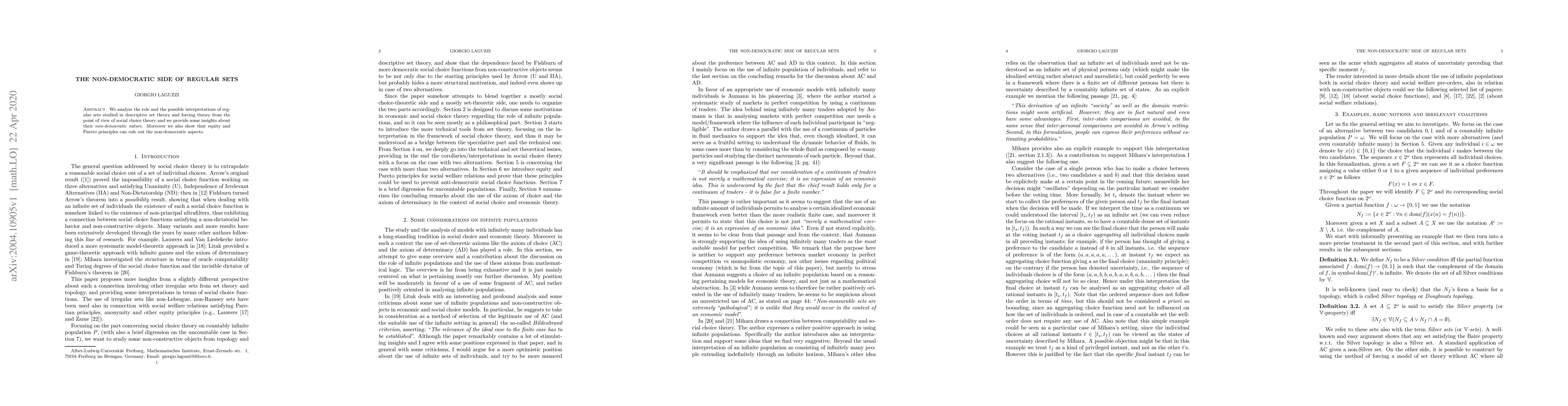 We analyse the role and the possible interpretations of regular sets studied in descriptive set theory and forcing theory from the point of view of social choice theory and we provide some insights about their non-democratic nature. Moreover we also show that equity and Pareto principles can rule out the non-democratic aspects.
