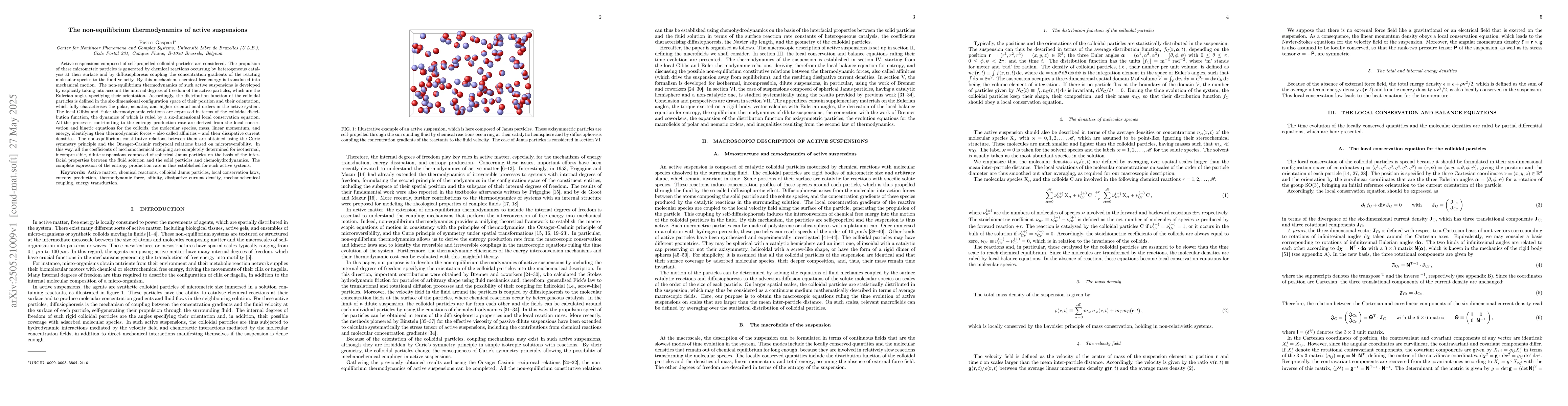 The research develops the non-equilibrium thermodynamics of active suspensions by considering self-propelled colloidal particles that convert chemical free energy into mechanical motion via heterogeneous catalysis and diffusiophoresis. It defines the distribution function in a six-dimensional configuration space, incorporating particle orientation, and derives entropy production rate using Curie symmetry principle and Onsager-Casimir reciprocal relations.