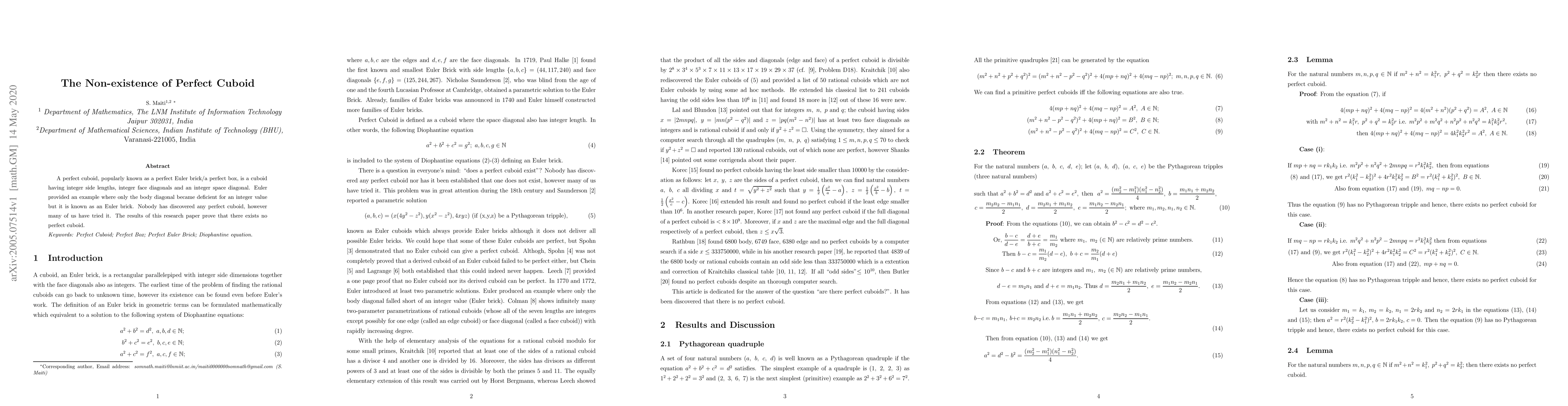 This paper conclusively demonstrates that no cuboid with integer side lengths, integer face diagonals, and an integer space diagonal—known as a perfect cuboid—exists. The research builds on previous attempts to find such a cuboid, ultimately proving its non-existence.