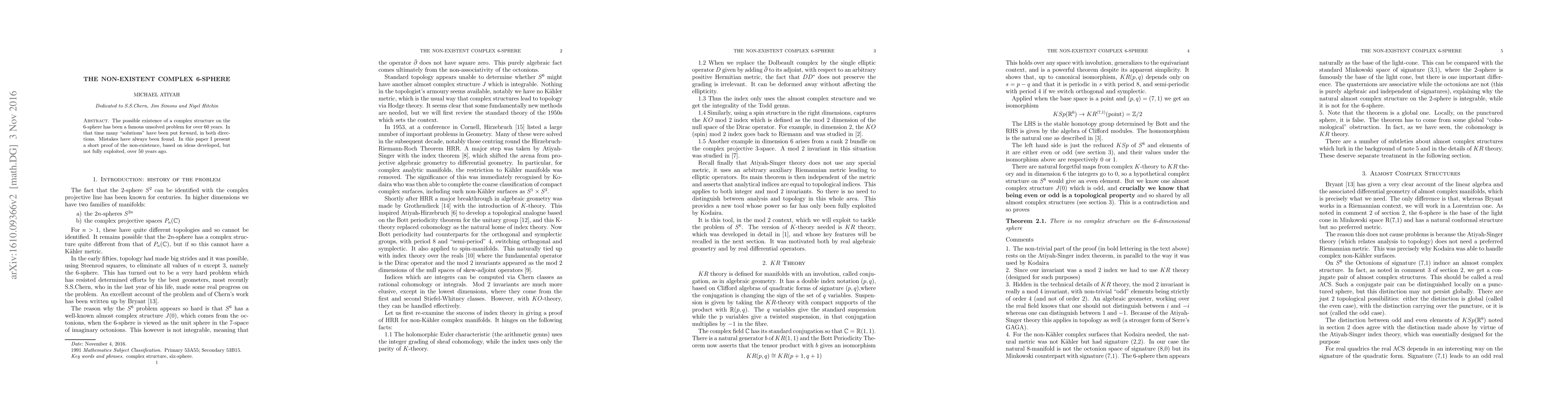 The possible existence of a complex structure on the 6-sphere has been a famous unsolved problem for over 60 years. In that time many "solutions" have been put forward, in both directions. Mistakes have always been found. In this paper I present a short proof of the non-existence, based on ideas developed, but not fully exploited, over 50 years ago. The only change in v2. is in section 3, where the notation has been clarified.