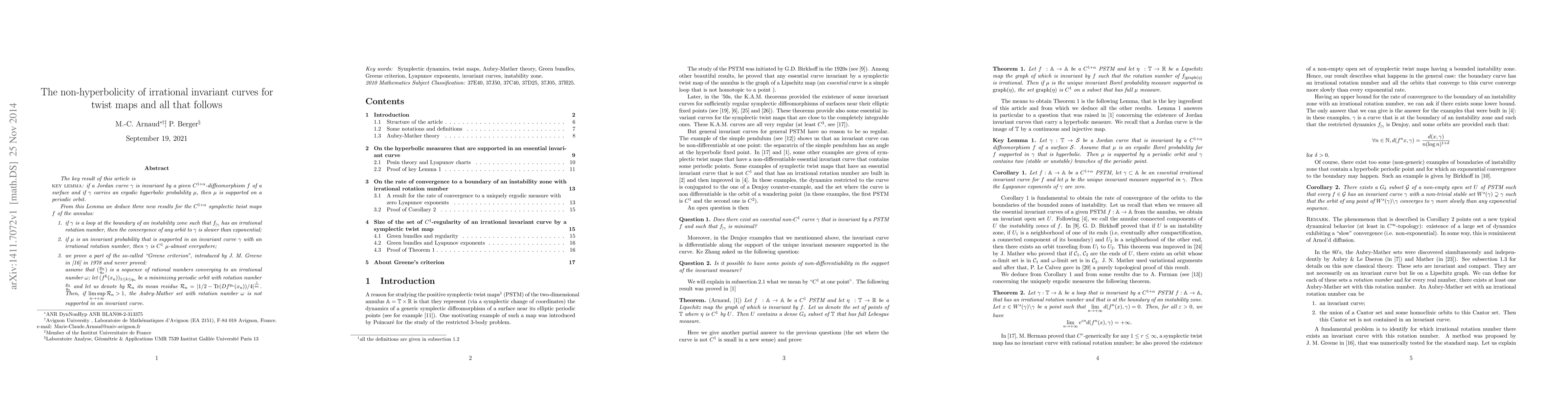 The key result of this article is key lemma: if a Jordan curve $\gamma$ is invariant by a given C 1+$\alpha$ -diffeomorphism f of a surface and if $\gamma$ carries an ergodic hyperbolic probability $\mu$, then $\mu$ is supported on a periodic orbit. From this Lemma we deduce three new results for the C 1+$\alpha$ symplectic twist maps f of the annulus: 1. if $\gamma$ is a loop at the boundary of an instability zone such that f |$\gamma$ has an irrational rotation number, then the convergence of any orbit to $\gamma$ is slower than exponential; 2. if $\mu$ is an invariant probability that is supported in an invariant curve $\gamma$ with an irrational rotation number, then $\gamma$ is C 1 $\mu$-almost everywhere; 3. we prove a part of the so-called "Greene criterion", introduced by J. M. Greene in [16] in 1978 and never proved: assume that (pn qn) is a sequence of rational numbers converging to an irrational number $\omega$; let (f k (x n)) 1$\le$k$\le$qn be a minimizing periodic orbit with rotation number pn qn and let us denote by R n its mean residue R n = |1/2 -- Tr(Df qn (x n))/4|