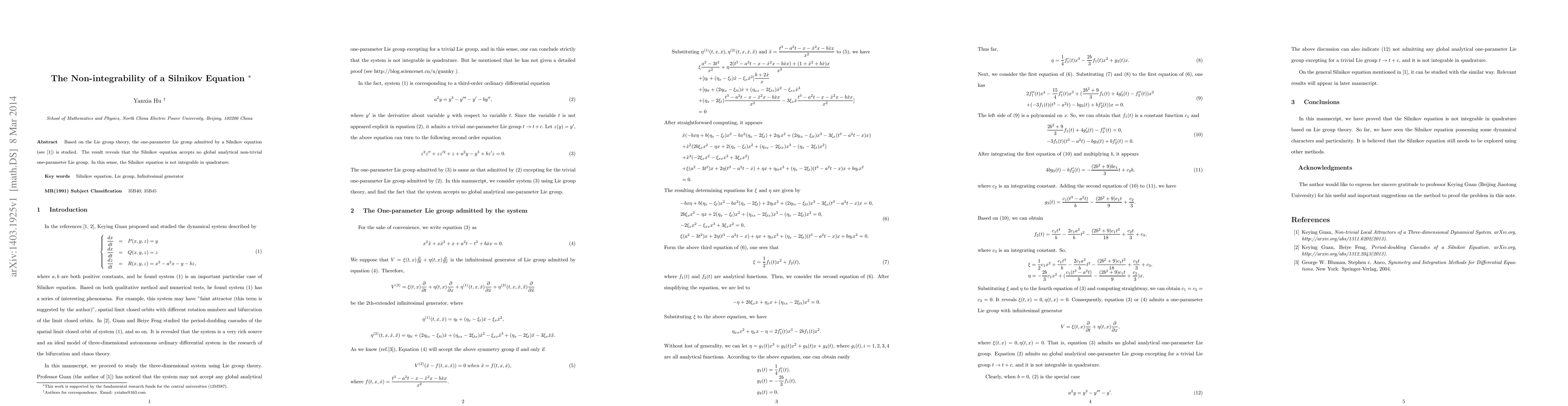 Summary: This study, utilizing Lie group theory, demonstrates that the Silnikov equation does not admit any global analytical non-trivial one-parameter Lie group, indicating its non-integrability in quadrature.