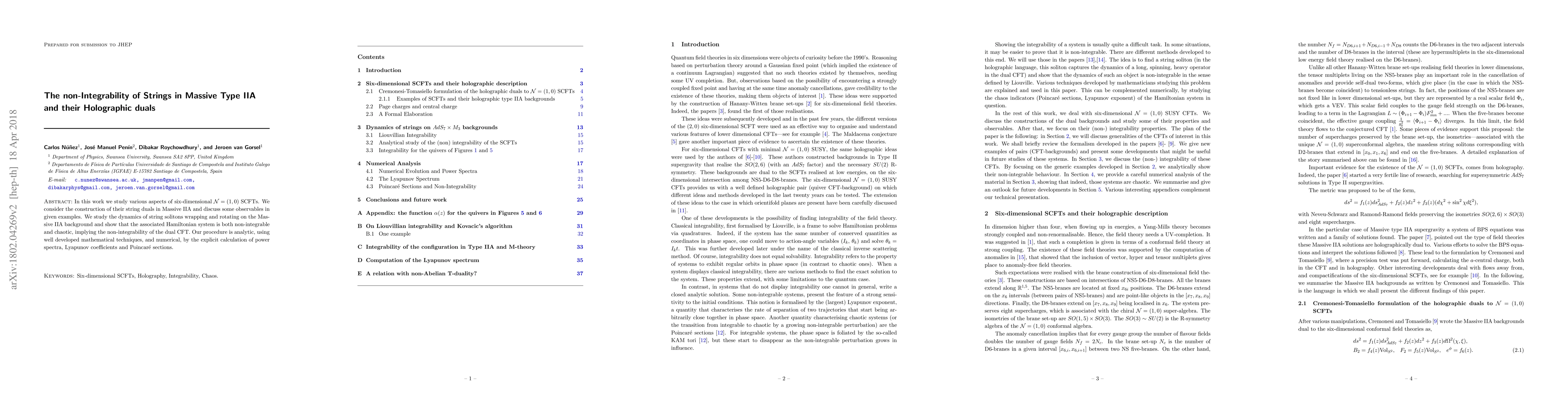 The paper explores six-dimensional ${\cal N}=(1,0)$ SCFTs and their dual string theories in Massive Type IIA, demonstrating that the dynamics of string solitons in this setup are non-integrable and chaotic, thereby indicating non-integrability in the dual CFT. Analytical and numerical methods, including power spectra and Lyapunov coefficients, support these findings.