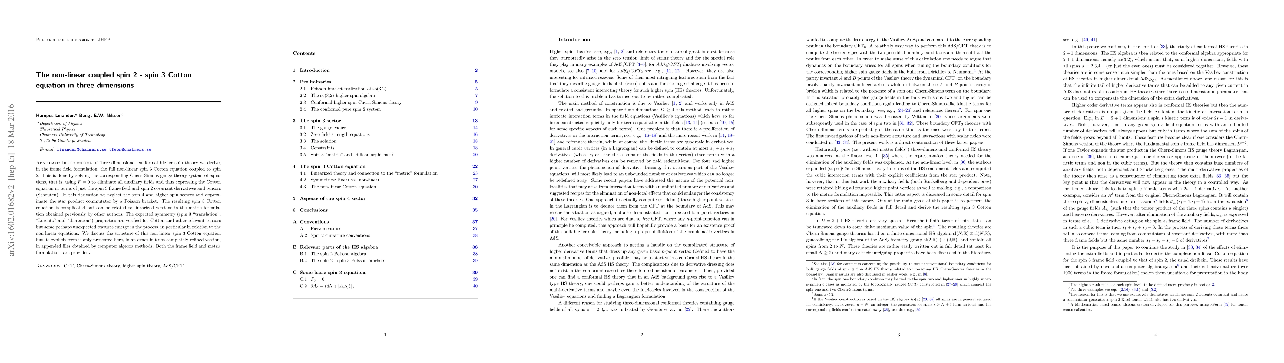 This research derives the full non-linear spin 3 Cotton equation coupled to spin 2 in three-dimensional conformal higher spin theory using frame field formulation and Chern-Simons gauge theory. The equation is complex but retains expected symmetry properties, with an exact but not fully refined explicit form provided through computer algebra methods.