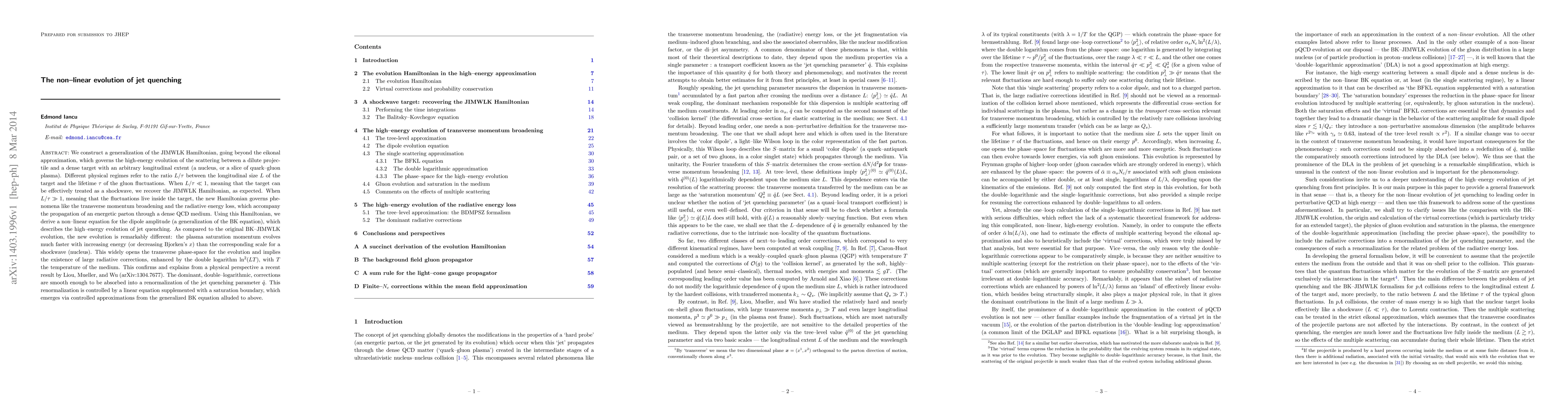We construct a generalization of the JIMWLK Hamiltonian, going beyond the eikonal approximation, which governs the high-energy evolution of the scattering between a dilute projectile and a dense target with an arbitrary longitudinal extent (a nucleus, or a slice of quark-gluon plasma). Different physical regimes refer to the ratio $L/\tau$ between the longitudinal size $L$ of the target and the lifetime $\tau$ of the gluon fluctuations. When $L/\tau \ll 1$, meaning that the target can be effectively treated as a shockwave, we recover the JIMWLK Hamiltonian, as expected. When $L/\tau \gg 1$, meaning that the fluctuations live inside the target, the new Hamiltonian governs phenomena like the transverse momentum broadening and the radiative energy loss, which accompany the propagation of an energetic parton through a dense QCD medium. Using this Hamiltonian, we derive a non-linear equation for the dipole amplitude (a generalization of the BK equation), which describes the high-energy evolution of jet quenching. As compared to the original BK-JIMWLK evolution, the new evolution is remarkably different: the plasma saturation momentum evolves much faster with increasing energy (or decreasing Bjorken's $x$) than the corresponding scale for a shockwave (nucleus). This widely opens the transverse phase-space for the evolution and implies the existence of large radiative corrections, enhanced by the double logarithm $\ln^2(LT)$, with $T$ the temperature of the medium. This confirms and explains from a physical perspective a recent result by Liou, Mueller, and Wu (arXiv:1304.7677). The dominant corrections are smooth enough to be absorbed into a renormalization of the jet quenching parameter $\hat q$. This renormalization is controlled by a linear equation supplemented with a saturation boundary, which emerges via controlled approximations from the generalized BK equation alluded to above.