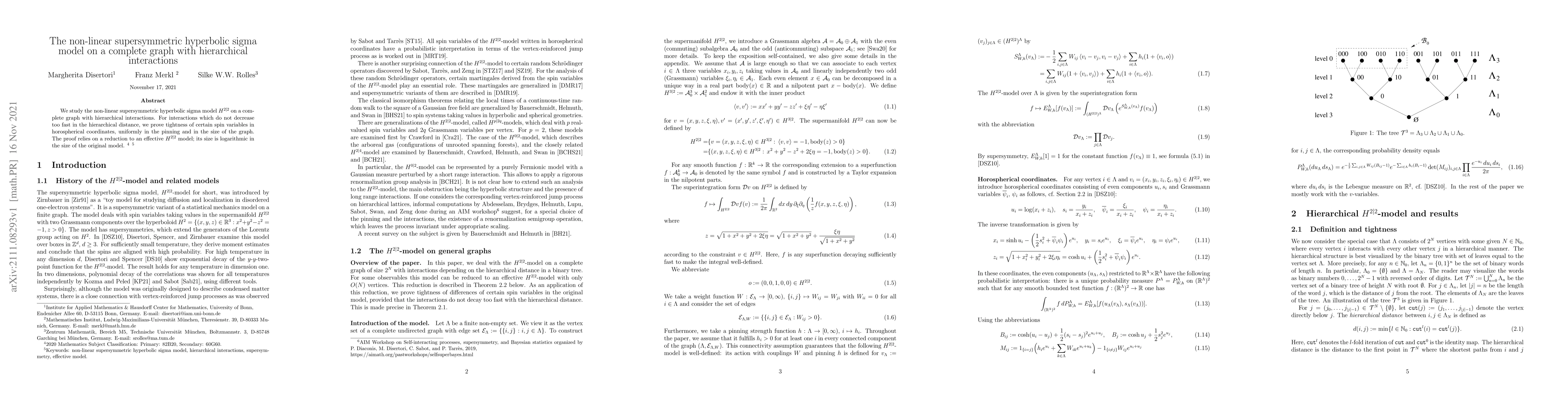Researchers study a supersymmetric hyperbolic sigma model on a complete graph with hierarchical interactions, proving tightness of spin variables in certain coordinates, with implications for understanding complex systems.