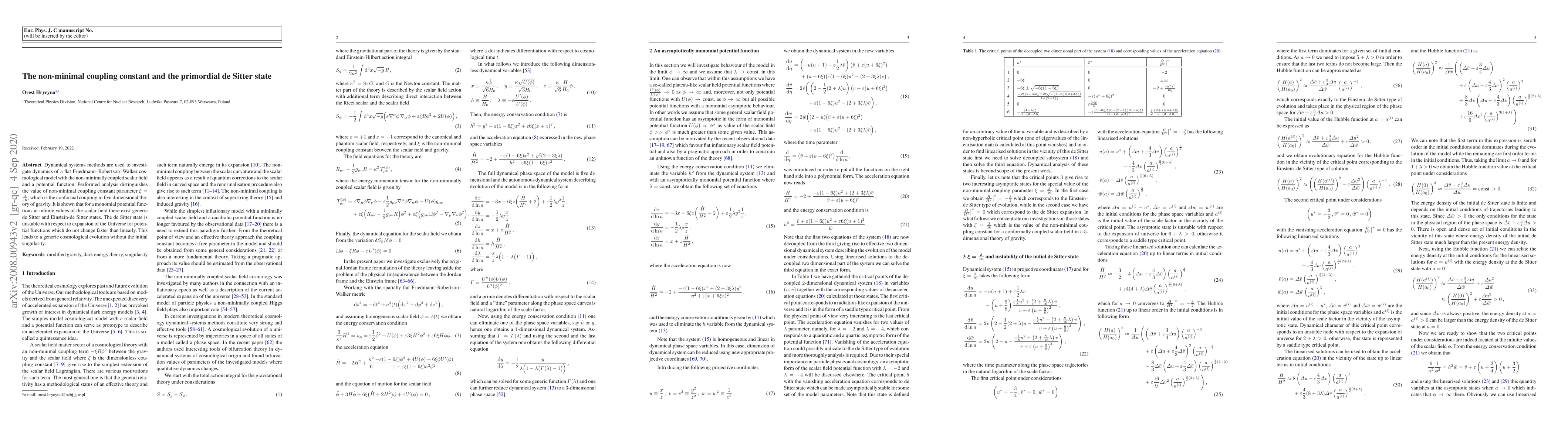 Dynamical systems methods are used to investigate dynamics of a flat Friedmann-Robertson-Walker cosmological model with the non-minimally coupled scalar field and a potential function. Performed analysis distinguishes the value of non-minimal coupling constant parameter $\xi=\frac{3}{16}$, which is the conformal coupling in five dimensional theory of gravity. It is shown that for a monomial potential functions at infinite values of the scalar field there exist generic de Sitter and Einstein-de Sitter states. The de Sitter state is unstable with respect to expansion of the Universe for potential functions which do not change faster than linearly. This leads to a generic cosmological evolution without the initial singularity.