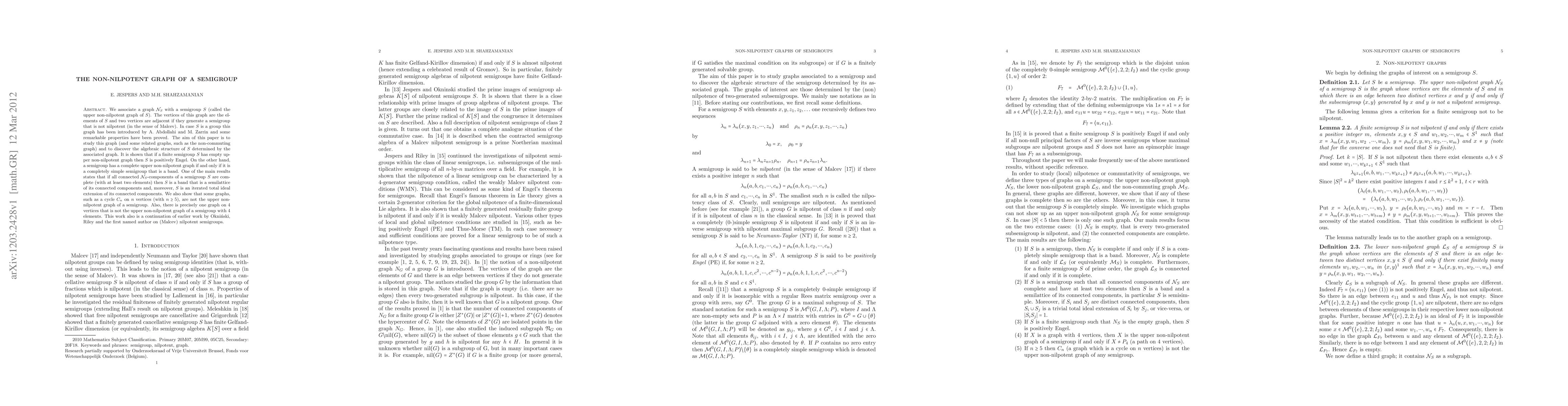 We associate a graph ${\mathcal N}_{S}$ with a semigroup $S$ (called the upper non-nilpotent graph of $S$). The vertices of this graph are the elements of $S$ and two vertices are adjacent if they generate a semigroup that is not nilpotent (in the sense of Malcev). In case $S$ is a group this graph has been introduced by A. Abdollahi and M. Zarrin and some remarkable properties have been proved. The aim of this paper is to study this graph (and some related graphs, such as the non-commuting graph) and to discover the algebraic structure of $S$ determined by the associated graph. It is shown that if a finite semigroup $S$ has empty upper non-nilpotent graph then $S$ is positively Engel. On the other hand, a semigroup has a complete upper non-nilpotent graph if and only if it is a completely simple semigroup that is a band. One of the main results states that if all connected ${\mathcal N}_{S}$-components of a semigroup $S$ are complete (with at least two elements) then $S$ is a band that is a semilattice of its connected components and, moreover, $S$ is an iterated total ideal extension of its connected components. We also show that some graphs, such as a cycle $C_{n}$ on $n$ vertices (with $n\geq 5$), are not the upper non-nilpotent graph of a semigroup. Also, there is precisely one graph on 4 vertices that is not the upper non-nilpotent graph of a semigroup with 4 elements. This work also is a continuation of earlier work by Okni\'nski, Riley and the first named author on (Malcev) nilpotent semigroups.