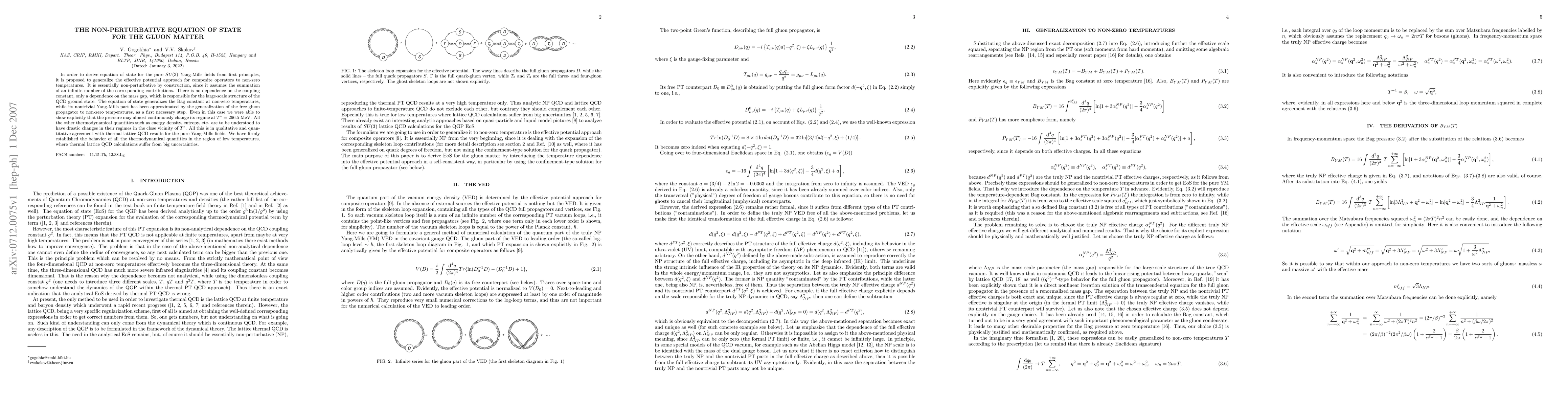 In order to derive equation of state for the pure SU(3) Yang-Mills fields from first principles, it is proposed to generalize the effective potential approach for composite operators to non-zero temperatures. It is essentially non-perturbative by construction, since it assumes the summation of an infinite number of the corresponding contributions. There is no dependence on the coupling constant, only a dependence on the mass gap, which is responsible for the large-scale structure of the QCD ground state. The equation of state generalizes the Bag constant at non-zero temperatures, while its nontrivial Yang-Mills part has been approximated by the generalization of the free gluon propagator to non-zero temperatures, as a first necessary step. Even in this case we were able to show explicitly that the pressure may almost continuously change its regime at $T^* = 266.5 MeV$.All the other thermodynamical quantities such as energy density, entropy, etc. are to be understood to have drastic changes in their regimes in the close vicinity of $T^*$. All this is in qualitative and quantitative agreement with thermal lattice QCD results for the pure Yang-Mills fields. We have firmly established the behavior of all the thermodynamical quantities in the region of low temperatures, where thermal lattice QCD calculations suffer from big uncertainties.