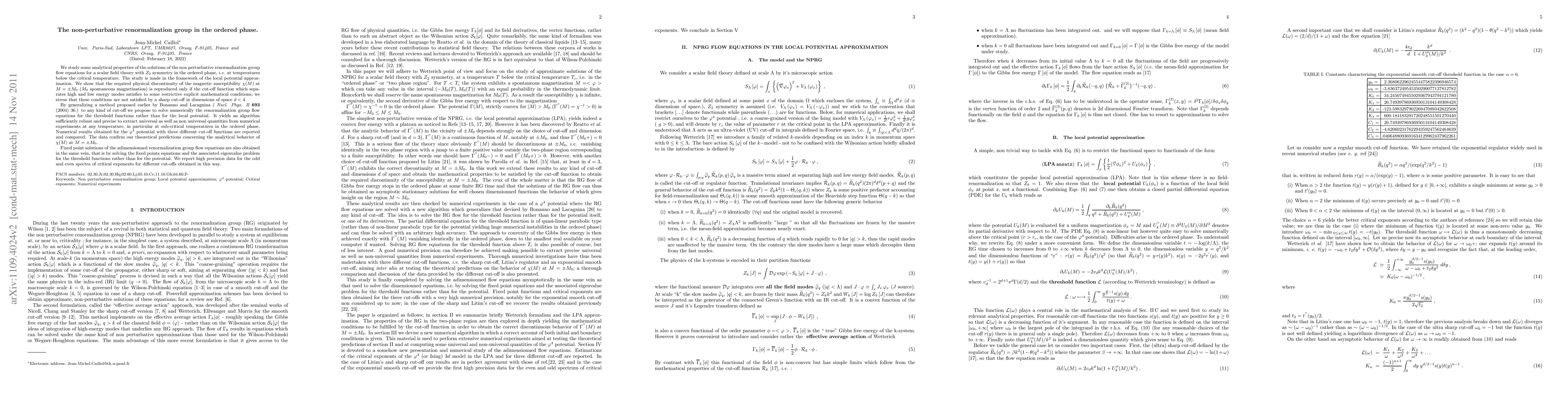 We study some analytical properties of the solutions of the non perturbative renormalization group flow equations for a scalar field theory with $Z_2$ symmetry in the ordered phase, i.e. at temperatures below the critical temperature. The study is made in the framework of the local potential approximation. We show that the required physical discontinuity of the magnetic susceptibility $\chi(M)$ at $M=\pm M_0$ ($M_0$ spontaneous magnetization) is reproduced only if the cut-off function which separates high and low energy modes satisfies to some restrictive explicit mathematical conditions; we stress that these conditions are not satisfied by a sharp cut-off in dimensions of space $d<4$.