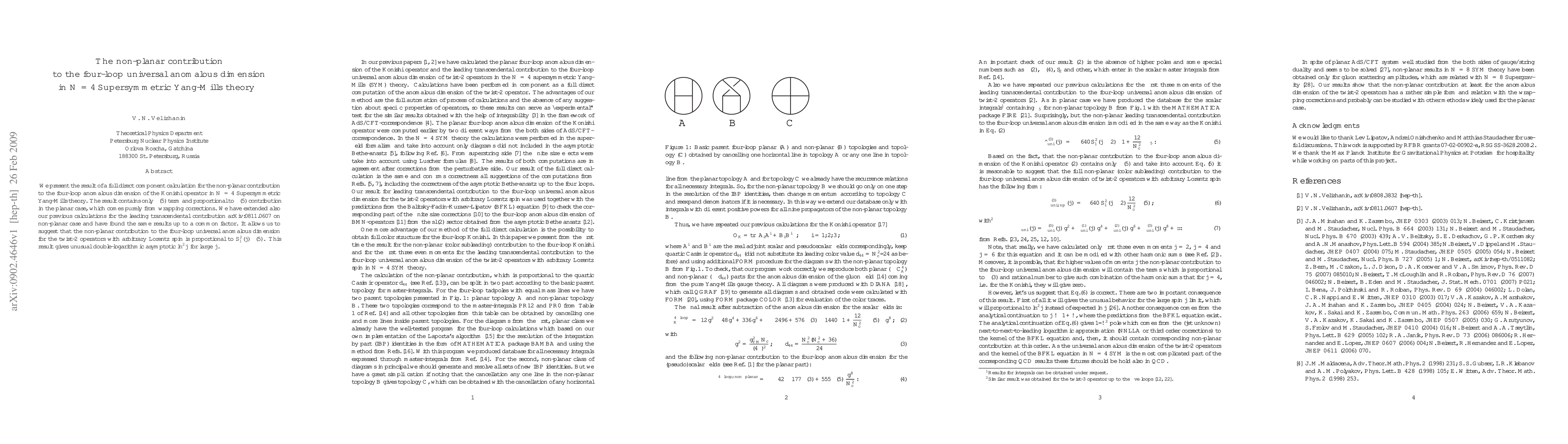 We present the result of a full direct component calculation for the non-planar contribution to the four-loop anomalous dimension of the Konishi operator in N =4 Supersymmetric Yang-Mills theory. The result contains only zeta(5) term and is proportional to zeta(5) contribution in the planar case, which comes purely from wrapping corrections. We have extended also our previous calculations for the leading transcendental contribution arXiv:0811.0607 on non-planar case and have found the same results up to a common factor. It allows us to suggest that the non-planar contribution to the four-loop universal anomalous dimension for the twist-2 operators with arbitrary Lorentz spin is proportional to $S_1^2(j) \zeta(5)$. This result gives unusual double-logarithmic asymptotic $\ln^2 j$ for large j.