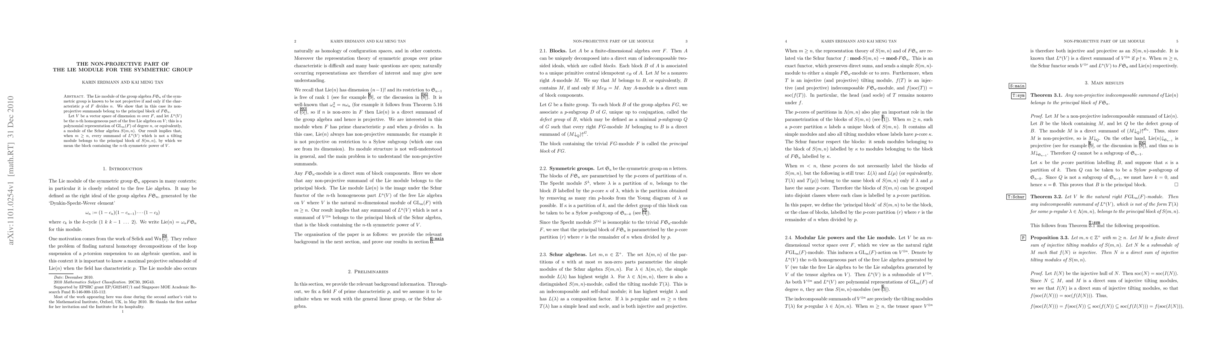 Research shows that for symmetric groups, non-projective Lie module parts belong to the principal block when characteristic of F divides n. This applies to polynomial representations like free Lie algebras on vector spaces.
