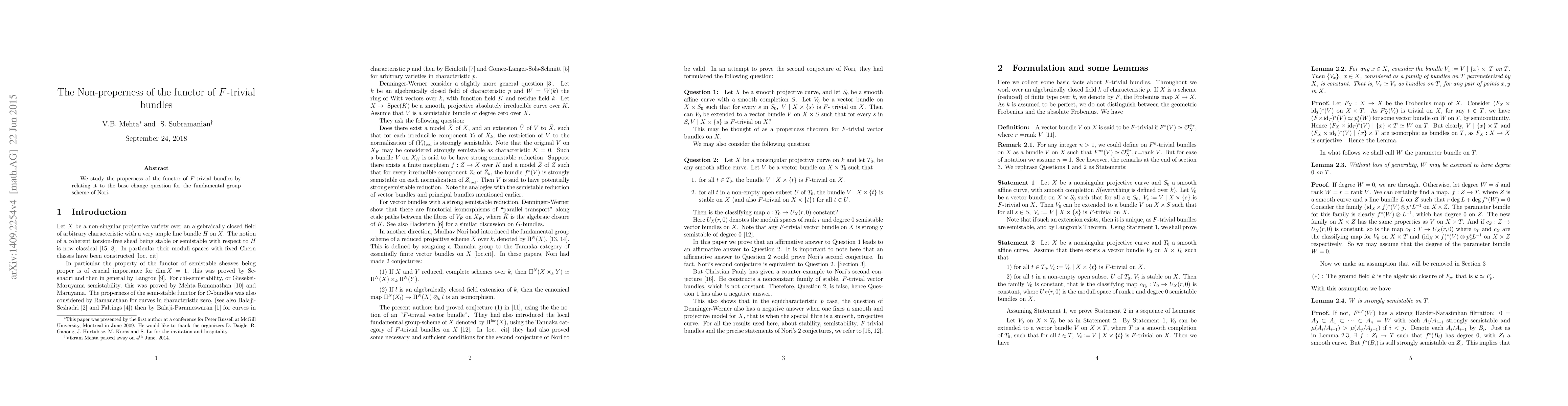 We study the properness of the functor of $F$-trivial bundles by relating it to the base change question for the fundamental group scheme of Nori.