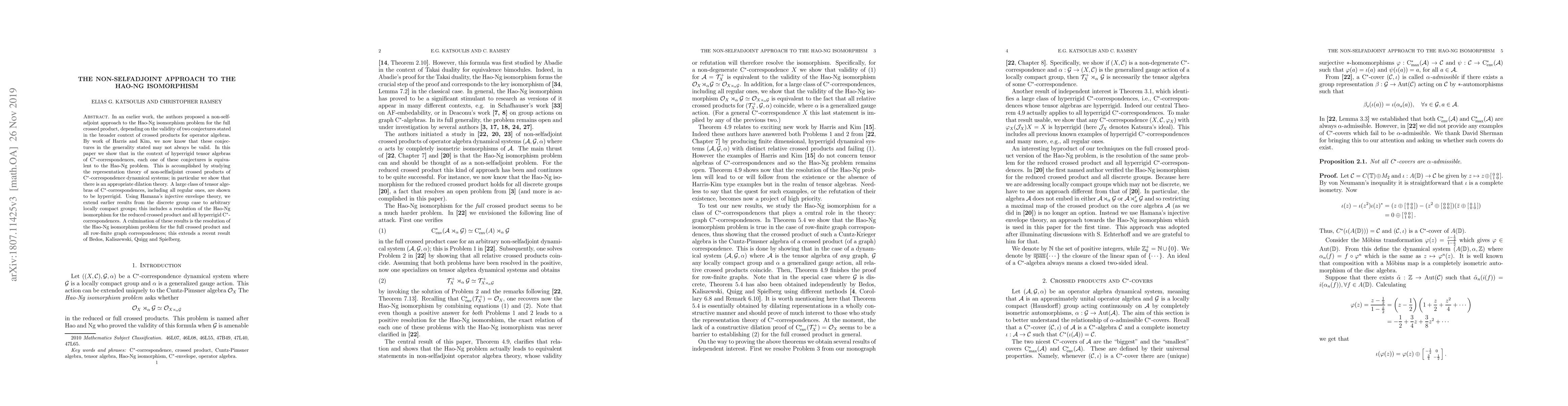 This paper resolves the Hao-Ng isomorphism problem for full crossed products using a non-selfadjoint approach, demonstrating the equivalence of certain conjectures to the problem through the representation theory of non-selfadjoint crossed products of C*-correspondence dynamical systems. It extends results from discrete groups to arbitrary locally compact groups and resolves the isomorphism for row-finite graph correspondences.