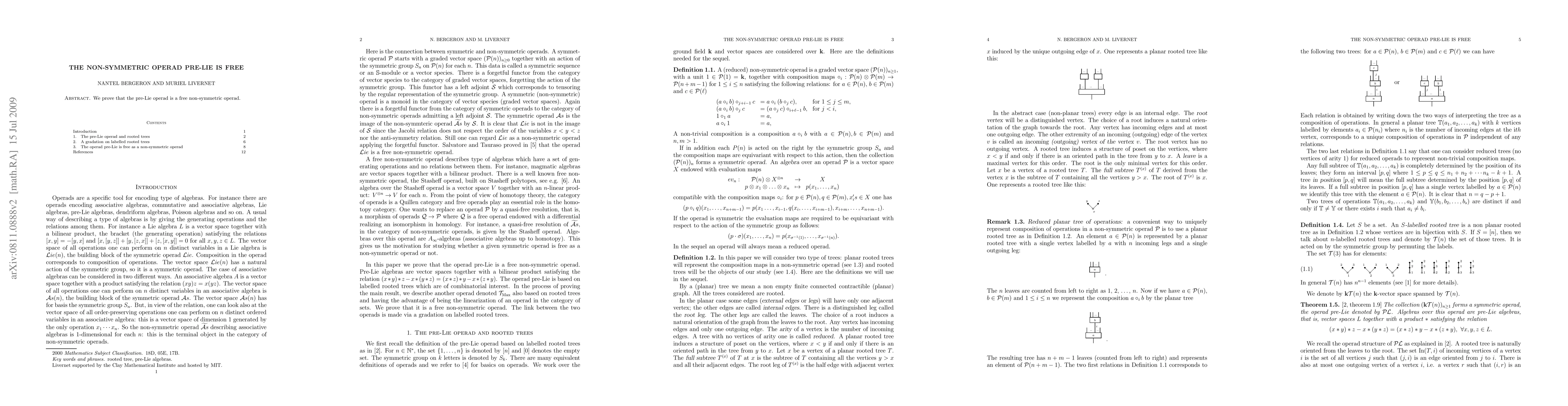 Summary: The paper demonstrates that the pre-Lie operad, which characterizes pre-Lie algebras, is a free non-symmetric operad, implying it is generated without any additional relations beyond associativity. This result has implications for understanding the structure of pre-Lie algebras.