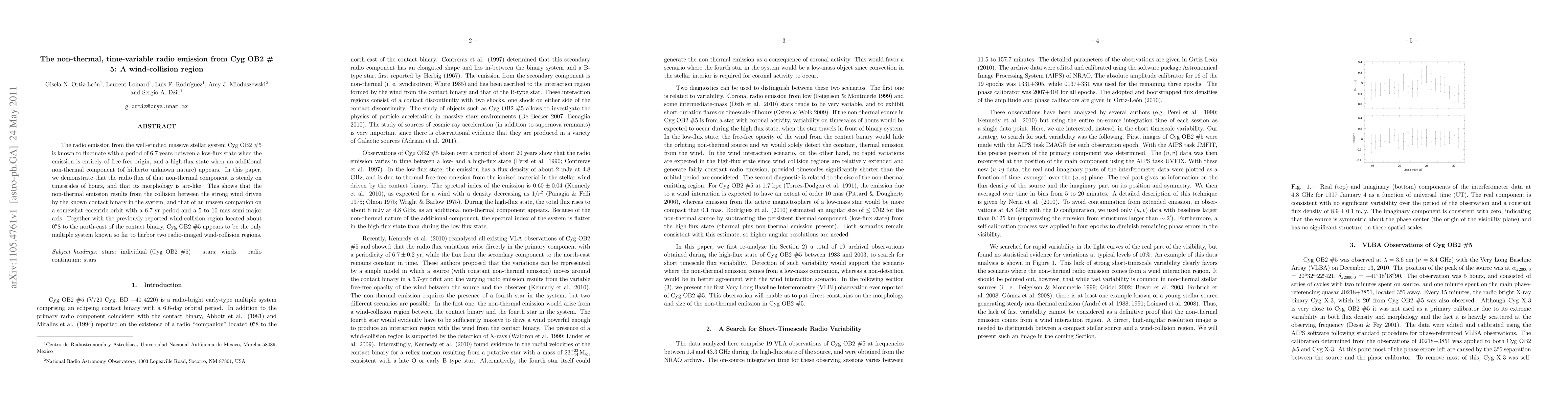 The radio emission from the well-studied massive stellar system Cyg OB2 #5 is known to fluctuate with a period of 6.7 years between a low-flux state when the emission is entirely of free-free origin, and a high-flux state when an additional non-thermal component (of hitherto unknown nature) appears. In this paper, we demonstrate that the radio flux of that non-thermal component is steady on timescales of hours, and that its morphology is arc-like. This shows that the non-thermal emission results from the collision between the strong wind driven by the known contact binary in the system, and that of an unseen companion on a somewhat eccentric orbit with a 6.7-yr period and a 5 to 10 mas semi-major axis. Together with the previously reported wind-collision region located about 0.8 arcsec to the north-east of the contact binary, Cyg OB2 #5 appears to be the only multiple system known so far to harbor two radio-imaged wind-collision regions.