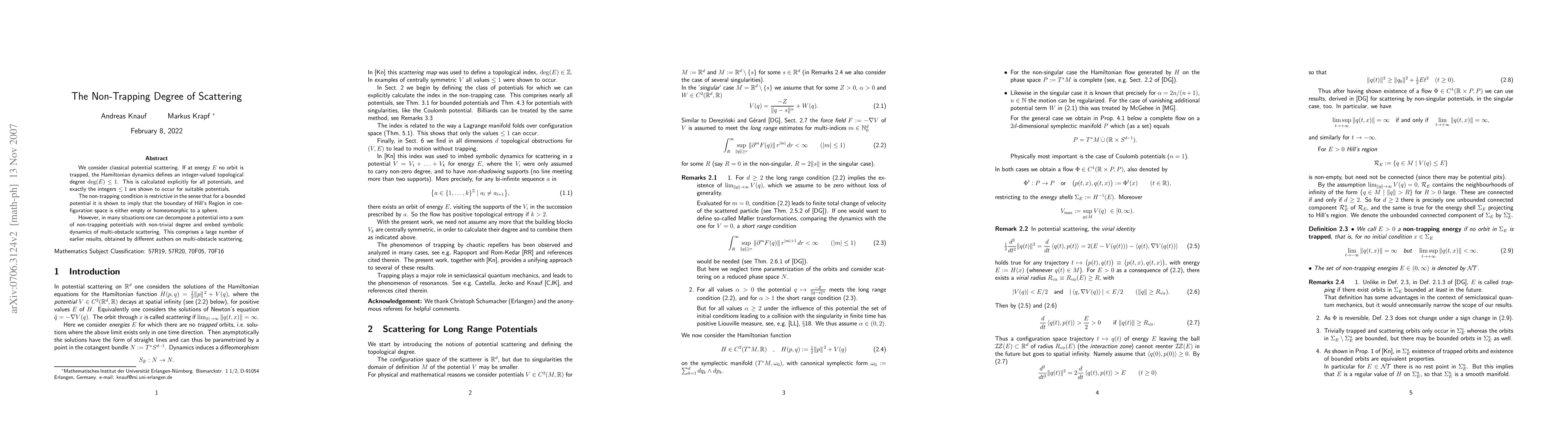 Researchers explore how energy affects topological degree in classical potential scattering, finding that non-trapping conditions imply a specific boundary condition for Hill's Region, with implications for understanding multi-obstacle scattering dynamics.