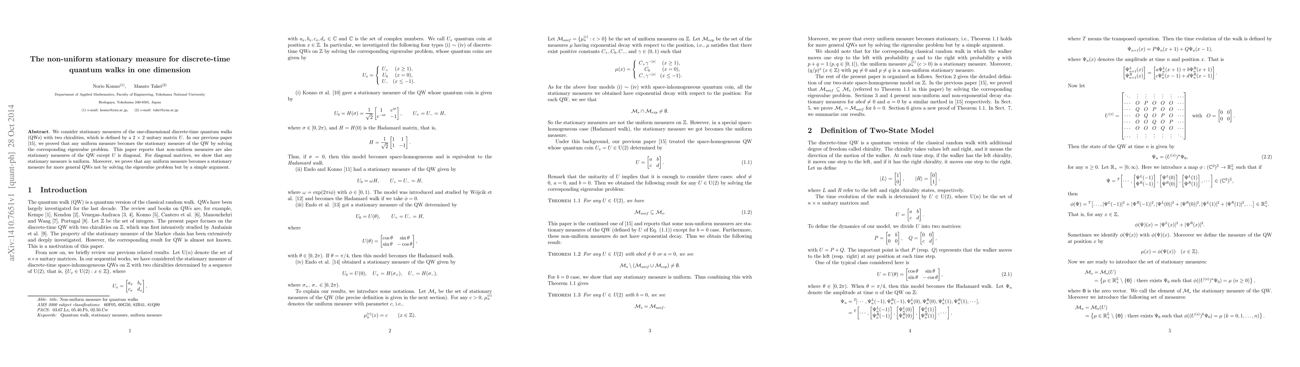 This paper investigates the stationary measures of one-dimensional discrete-time quantum walks (QWs) with two chiralities, showing that non-uniform measures can also be stationary except when the unitary matrix U is diagonal. For diagonal matrices, any stationary measure is proven to be uniform.